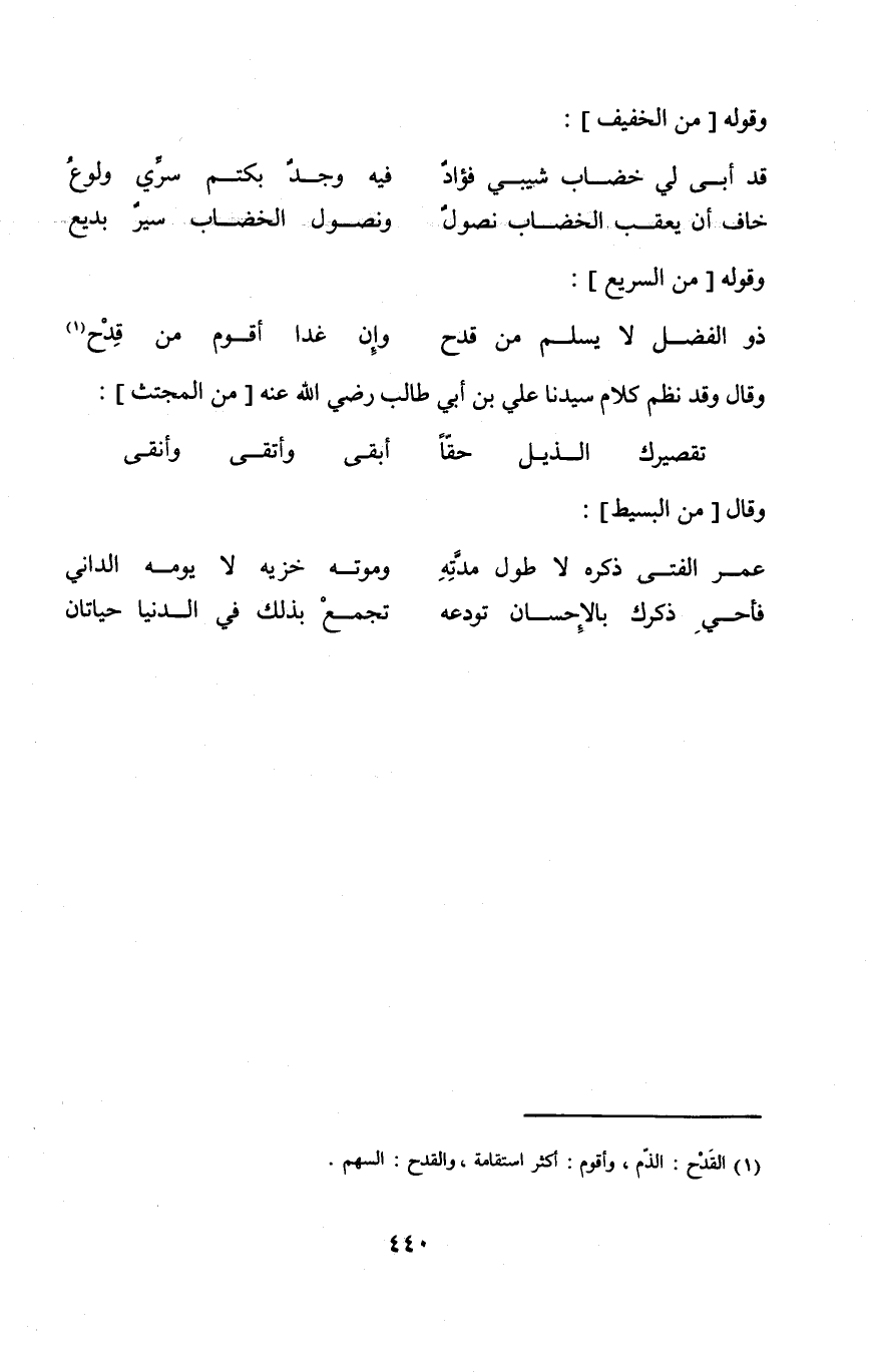 (خَافَ أَن يعقب الخضاب نصول ... ونصول الخضاب سير بديع) // من الْخَفِيف //