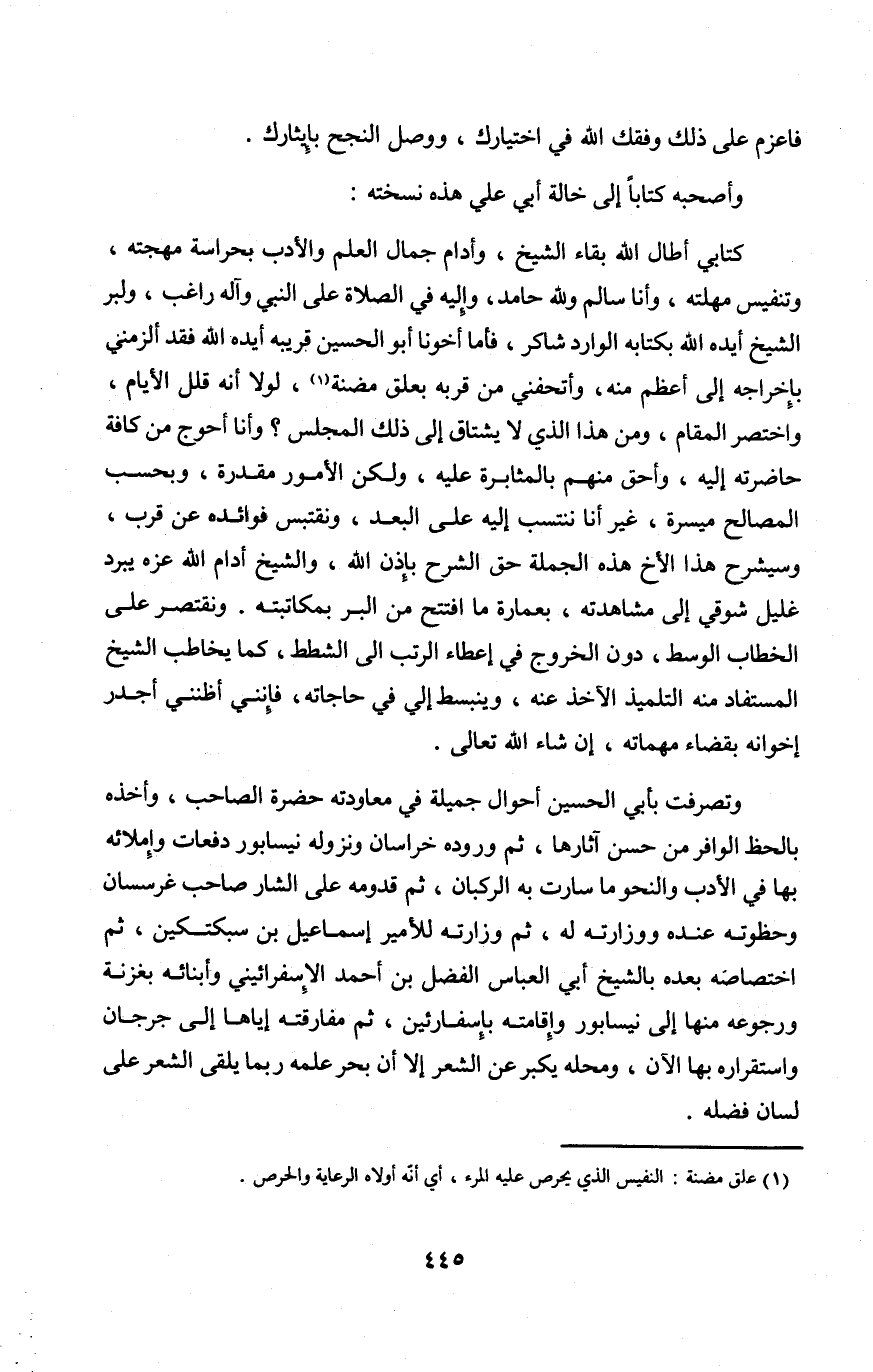 كتابي أَطَالَ الله بَقَاء الشَّيْخ وأدام جمال الْعلم وَالْأَدب بحراسة مهجته وتنفيس مهلته وَأَنا سَالم وَللَّه حَامِد وَإِلَيْهِ فِي الصَّلَاة على النَّبِي وَآله رَاغِب ولبر الشَّيْخ أيده الله بكتابه الْوَارِد شَاكر فَأَما أخونا أَبُو الْحُسَيْن قَرِيبه أيده الله فقد ألزمني بِإِخْرَاجِهِ إِلَى أعظم مِنْهُ وأتحفني من قربه بعلق مضنة لَوْلَا أَنه قلل الْأَيَّام وَاخْتصرَ الْمقَام وَمن هَذَا الَّذِي لَا يشتاق إِلَى ذَلِك الْمجْلس وَأَنا أحْوج من كَافَّة حاضرته إِلَيْهِ وأحق مِنْهُم بالمثابرة عَلَيْهِ وَلَكِن الْأُمُور مقدرَة وبحسب الْمصَالح ميسرَة غير أَنا ننتسب إِلَيْهِ على الْبعد ونقتبس فَوَائده عَن قرب وسيشرح هَذَا الْأَخ هَذِه الْجُمْلَة حق الشَّرْح بِإِذن الله وَالشَّيْخ أدام الله عزه يبرد غليل شوقي إِلَى مشاهدته بعمارة مَا افْتتح من الْبر بمكاتبته