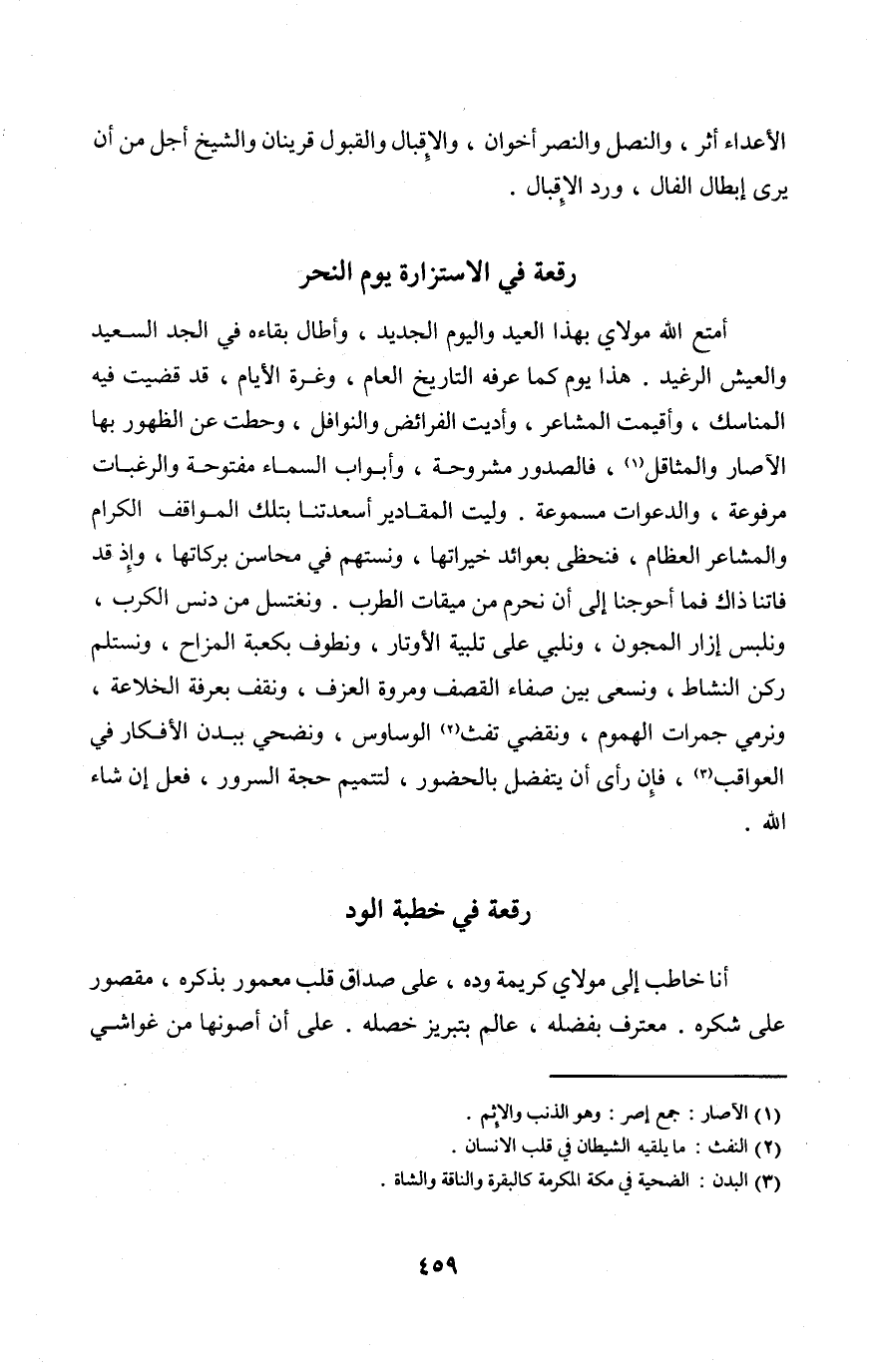ونغتسل من دنس الكرب ونلبس إِزَار المجون ونلبي على تَلْبِيَة الأوتار ونطوف بكعبة المزاح ونستلم ركن النشاط ونسعى بَين صفاء القصف ومروة العزف ونقف بِعَرَفَة الخلاعة ونرمي جمرات الهموم ونقضي تفث الوساوس ونضحي ببدن الأفكار فِي العواقب فَإِن رأى أَن يتفضل بالحضور لتتميم حجَّة السرُور فعل إِن شَاءَ الله