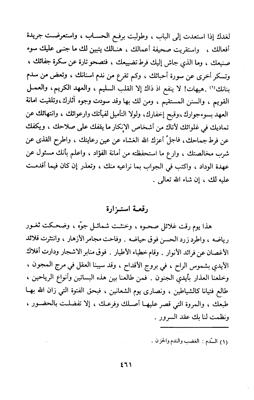 هَيْهَات لَا ينفع إِذْ ذَاك إِلَى الْقلب السَّلِيم والعهد الْكَرِيم وَالْعَمَل القويم وَالسّنَن الْمُسْتَقيم وَمن لَك بهَا وَقد سودت وُجُوه آثارك وتلقيت أَمَانَة الْعَهْد بِسوء جوارك وقبح إخفارك وَلَوْلَا التأميل لفيأتك وارعوائك وانتهائك عَن تماديك فِي غلوائك لأتاك من أشخاص الْإِنْكَار مَا يقفك على صلاحك ويكفك عَن فرط جماحك فاجل أعزّك الله الغشاء عَن عين رعايتك واطرح القذى عَن شرب مخالصتك وارع مَا استحفظته من أَمَانَة الْفُؤَاد وَاعْلَم بأنك مسئول عَن عُهْدَة الوداد واكتب فِي الْجَواب بِمَا نراعيه مِنْك وَتعذر إِن كَانَ فِيمَا أقدمت عَلَيْهِ لَك إِن شَاءَ الله تَعَالَى