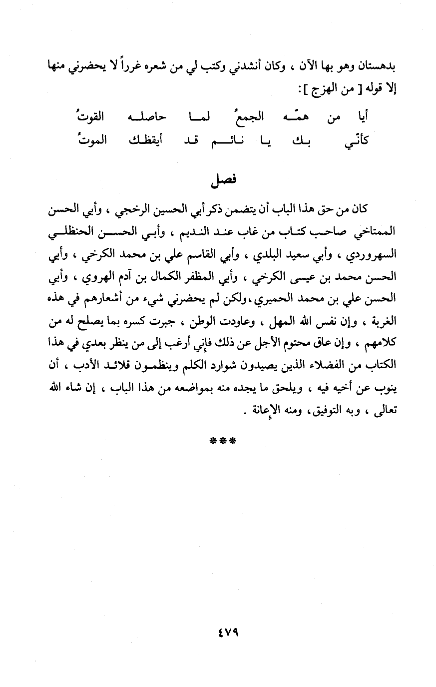كَانَ من حق هَذَا الْبَاب أَن يتَضَمَّن ذكر أبي الْحُسَيْن الرخجي وَأبي الْحسن الممتاخي صَاحب كتاب من غَابَ عِنْد النديم وَأبي الْحسن الْحَنْظَلِي السهروردي وَأبي سعيد الْبَلَدِي وَأبي الْقَاسِم عَليّ بن مُحَمَّد الْكَرْخِي وَأبي الْحسن مُحَمَّد بن عِيسَى الْكَرْخِي وَأبي المظفر الْكَمَال بن آدم الْهَرَوِيّ وَأبي الْحسن عَليّ بن مُحَمَّد الْحِمْيَرِي وَلَكِن لم يحضرني شي من أشعارهم فِي هَذِه الغربة وَإِن نفس الله الْمهل وعاودت الوطن جبرت كَسره بِمَا يصلح لَهُ من كَلَامهم وَإِن عَاق محتوم الْأَجَل عَن ذَلِك فَإِنِّي أَرغب إِلَى من ينظر بعدِي فِي هَذَا الْكتاب من الْفُضَلَاء الَّذين يصيدون شوارد الْكَلم وينظمون قلائد الْأَدَب أَن يَنُوب عَن أَخِيه فِيهِ وَيلْحق مَا يجده مِنْهُ بمواضعه من هَذَا الْبَاب إِن شَاءَ الله تَعَالَى وَبِه التَّوْفِيق وَمِنْه الْإِعَانَة