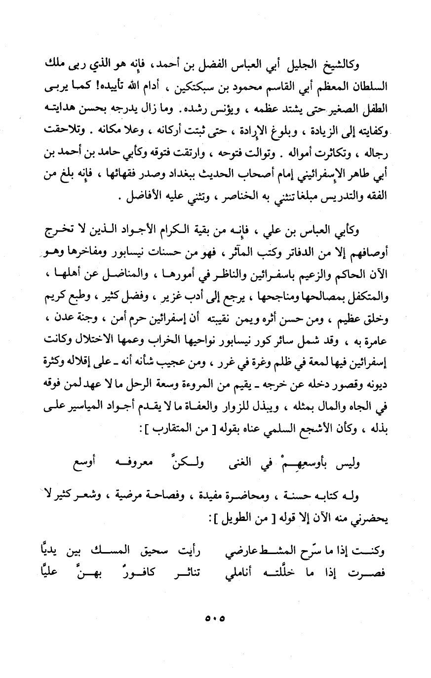 وكأبي الْعَبَّاس بن عَليّ فَإِنَّهُ من بَقِيَّة الْكِرَام الأجواد الَّذين لَا تخرج أوصافهم إِلَّا من الدفاتر وَكتب المآثر فَهُوَ من حَسَنَات نيسابور ومفاخرها وَهُوَ الْآن الْحَاكِم والزعيم بأسفرائين والناظر فِي أمورها والمناضل عَن أَهلهَا والمتكفل بمصالحها ومناجحها يرجع إِلَى أدب غزير وَفضل كثير وطبع كريم وَخلق عَظِيم وَمن حسن أَثَره ويمن نقيبته أَن إسفرائين حرم أَمن وجنة عدن عامرة بِهِ وَقد شَمل سَائِر كور نيسابور نَوَاحِيهَا الخراب وعمها الاختلال وَكَانَت إسفرائين فِيهَا لمْعَة فِي ظلم وغرة فِي غرر وَمن عَجِيب شَأْنه أَنه على إقلاله وَكَثْرَة دُيُونه وقصور دخله عَن خرجه يُقيم من الْمُرُوءَة وسعة الرحل مَا لَا عهد لمن فَوْقه فِي الجاه وَالْمَال بِمثلِهِ ويبذل للزوار والعفاة مَا لَا يقدم أجواد المياسير على بذله وَكَأن الأشجع السّلمِيّ عناه بقوله