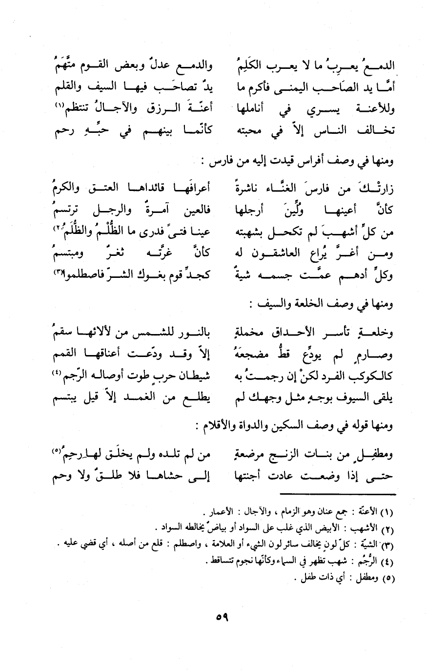 (وصارم لم يودع قطّ مضجعه ... إِلَّا وَقد ودعت أعناقها القمم)