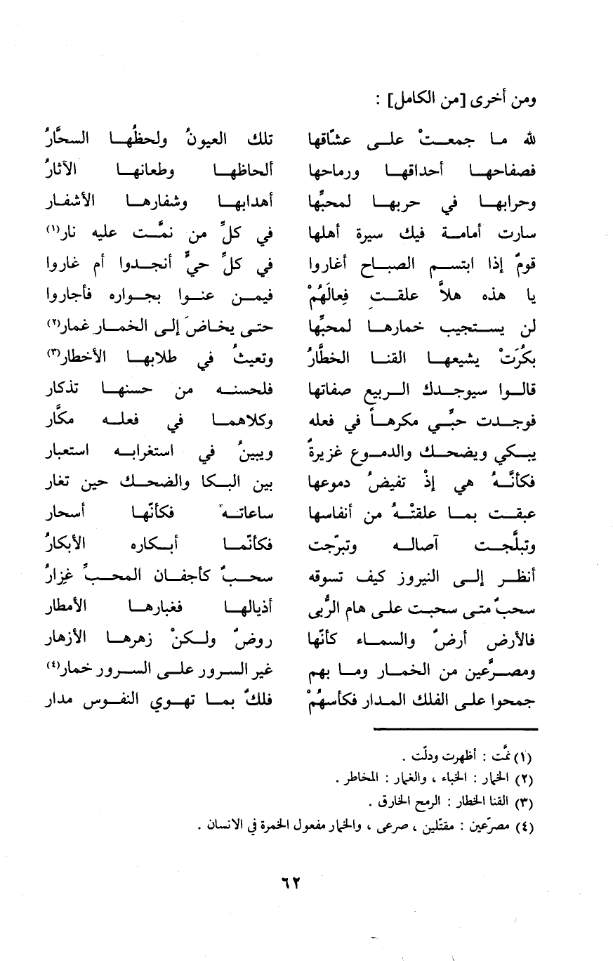 (لله مَا جمعت على عشاقها ... تِلْكَ الْعُيُون ولحظها السحار)