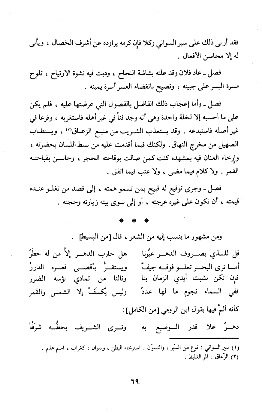 فصل وَجرى توقيع لَهُ قَبِيح بِمن تسمو همته إِلَى قصد من تغلو عِنْده قِيمَته أَن تكون على غَيره عرجته أَو إِلَى سوى بَيته زيارته وحجته