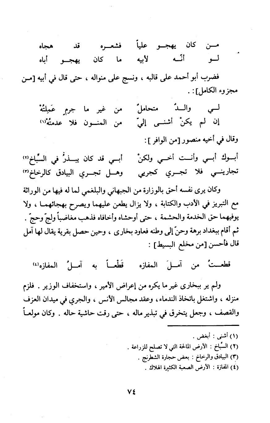 وَكَانَ يرى نَفسه أَحَق بالوزارة من الجبهاني والبلغمي لما لَهُ فِيهَا من الوراثة مَعَ التبريز فِي الْأَدَب وَالْكِتَابَة وَلَا يزَال يطعن عَلَيْهِمَا وَيُصَرح بهجائهما وَلَا يوفيهما حق الْخدمَة والحشمة حَتَّى أوحشاه وأخافاه فَذهب مغاضبا ولج وَحج