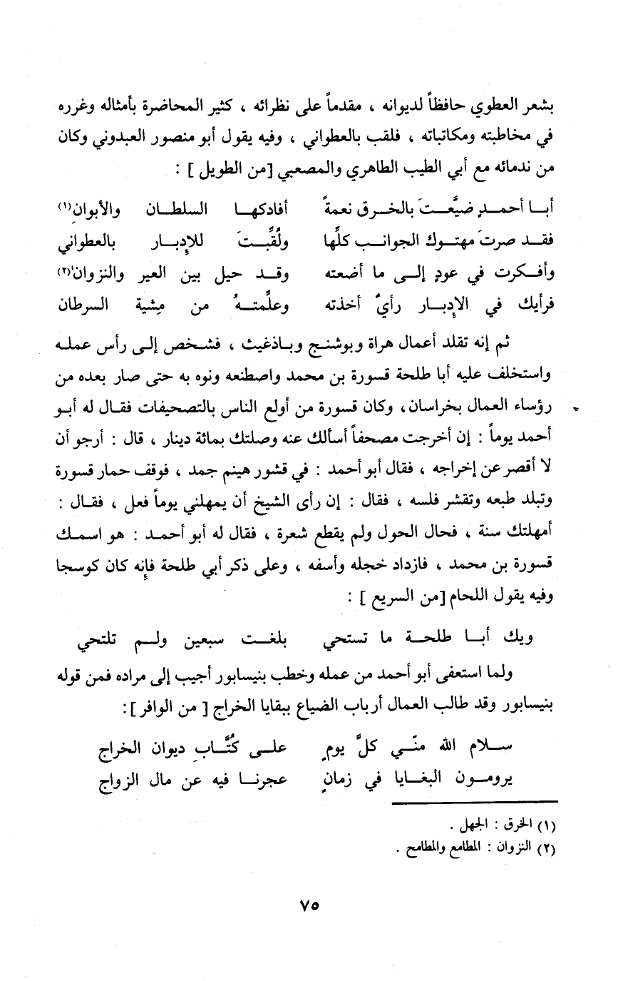 وَلما استعفى أَبُو أَحْمد من عمله وخطب بنيسابور أُجِيب إِلَى مُرَاده فَمن قَوْله بنيسابور وَقد طَالب الْعمَّال أَرْبَاب الضّيَاع ببقايا الْخراج
