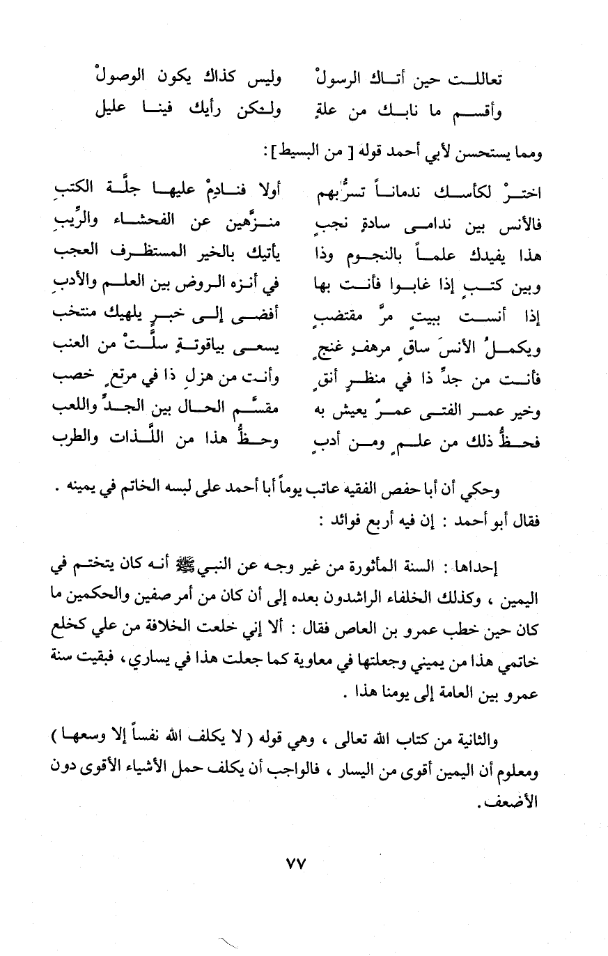 وَحكي أَن أَبَا حَفْص الْفَقِيه عَاتب يَوْمًا أَبَا أَحْمد على لبسه الْخَاتم فِي يَمِينه