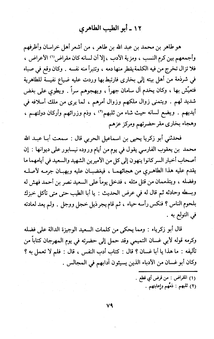 فَحَدثني أَبُو زَكَرِيَّا يحيى بن إِسْمَاعِيل الْحَرْبِيّ قَالَ سَمِعت أَبَا عبد الله مُحَمَّد بن يَعْقُوب الْفَارِسِي يَقُول فِي يَوْم من أَيَّام وُرُوده نيسابور على ديوانها إِن أَصْحَاب أَخْبَار السِّرّ كَانُوا ينهون إِلَى كل من الأميرين الشَّهِيد والسعيد فِي أيامهما مَا يقدم عَلَيْهِ هَذَا الطاهري من هجائهما فيغضبان عَلَيْهِ ويهبان جرمه لأصله وفضله ويتذممان من قتل مثله فَدخل يَوْمًا على السعيد نصر بن أَحْمد فهش لَهُ وَبسطه وحادثه ثمَّ قَالَ لَهُ فِي عرض الحَدِيث يَا أَبَا الطّيب حَتَّى مَتى تَأْكُل خبزك بلحوم النَّاس فَنَكس رَأسه حَيَاء ثمَّ قَامَ يجر ذيل خجل ووجل