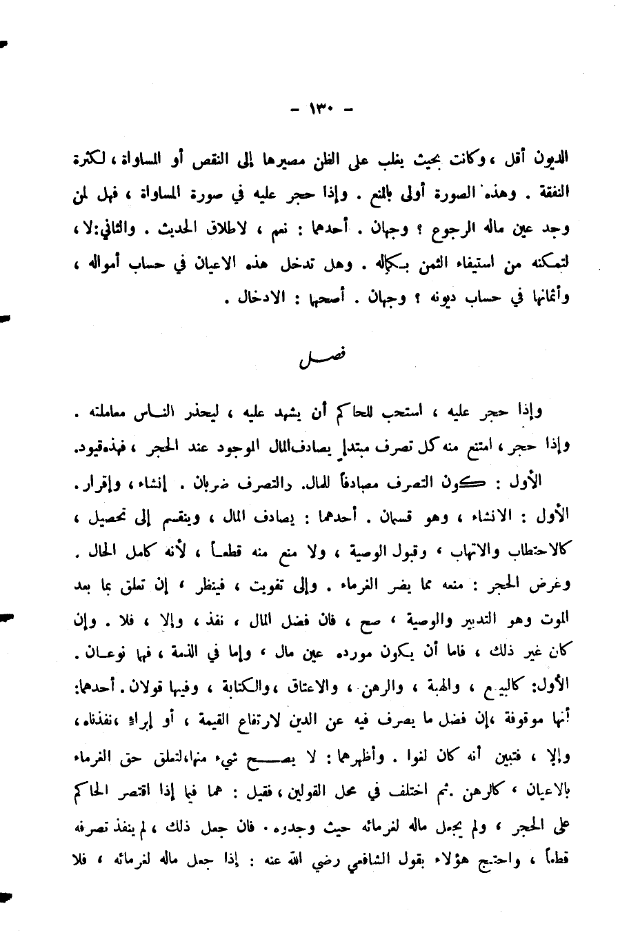وَإِذَا حَجَرَ عَلَيْهِ، اسْتُحِبَّ لِلْحَاكِمِ أَنْ يُشْهِدَ عَلَيْهِ، لِيَحْذَرَ النَّاسُ مُعَامَلَتَهُ. وَإِذَا حَجَرَ، امْتَنَعَ مِنْهُ كُلُّ تَصَرُّفٍ مُبْتَدَأٍ يُصَادِفُ الْمَالَ الْمَوْجُودَ عِنْدَ الْحَجْرِ، فَهَذِهِ قُيُودٌ. الْأَوَّلُ: كَوْنُ التَّصَرُّفِ مُصَادِفًا لِلْمَالِ. وَالتَّصَرُّفُ ضَرْبَانِ. إِنْشَاءٌ، وَإِقْرَارٌ.