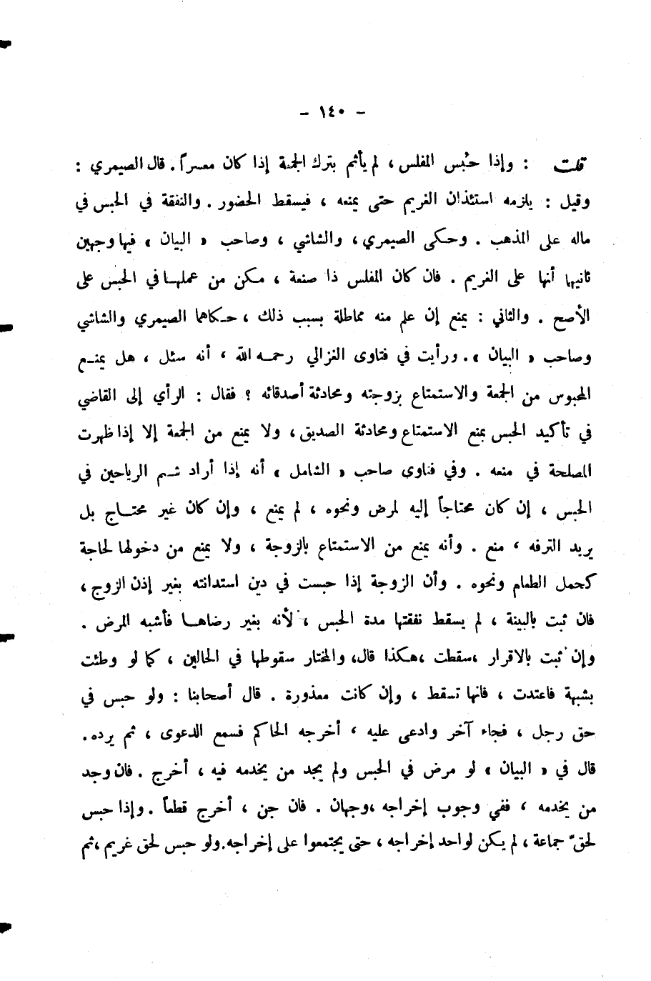 قُلْتُ: وَإِذَا حُبِسَ الْمُفْلِسُ لَمْ يَأْثَمْ بِتَرْكِ الْجُمْعَةِ إِذَا كَانَ مُعْسِرًا. قَالَ الصَّيْمَرِيُّ: وَقِيلَ: يَلْزَمُهُ اسْتِئْذَانُ الْغَرِيمِ حَتَّى يَمْنَعَهُ، فَيَسْقُطُ الْحُضُورُ. وَالنَّفَقَةُ فِي الْحَبْسِ فِي مَالِهِ عَلَى الْمَذْهَبِ. وَحَكَى الصَّيْمَرِيُّ، وَالشَّاشِيُّ، وَصَاحِبُ «الْبَيَانِ» فِيهَا وَجْهَيْنِ ثَانِيهِمَا أَنَّهَا عَلَى الْغَرِيمِ. فَإِنْ كَانَ الْمُفْلِسُ ذَا صَنْعَةٍ، مُكِّنَ مِنْ عَمَلِهَا فِي الْحَبْسِ عَلَى الْأَصَحِّ.