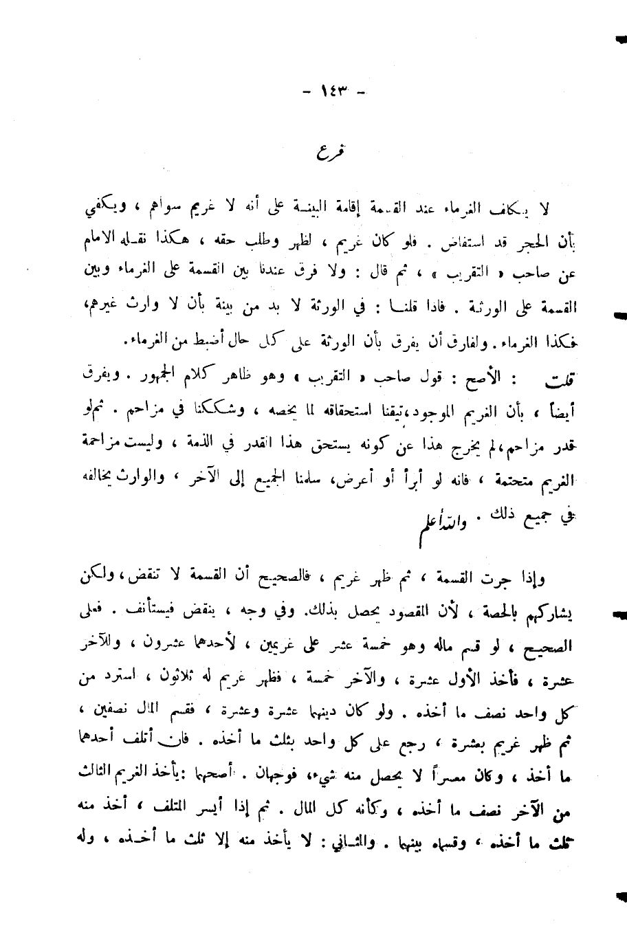 قُلْتُ: الْأَصَحُّ: قَوْلُ صَاحِبِ «التَّقْرِيبِ» وَهُوَ ظَاهِرُ كَلَامِ الْجُمْهُورِ. وَيُفَرَّقُ أَيْضًا، بِأَنِ الْغَرِيمَ الْمَوْجُودَ، تَيَقَّنَا اسْتِحْقَاقَهُ لِمَا يَخُصُّهُ، وَشَكَكْنَا فِي مُزَاحِمٍ. ثُمَّ لَوْ قُدِّرَ مُزَاحِمٌ لَمْ يَخْرُجْ هَذَا عَنْ كَوْنِهِ يَسْتَحِقُّ هَذَا الْقَدْرَ فِي الذِّمَّةِ، وَلَيْسَتْ مُزَاحَمَةُ الْغَرِيمِ مُتَحَتِّمَةٌ، فَإِنَّهُ لَوْ أَبْرَأَ أَوْ أَعْرَضَ، سَلَّمْنَا الْجَمِيعَ إِلَى الْآخَرِ، وَالْوَارِثُ يُخَالِفُهُ فِي جَمِيعِ ذَلِكَ. وَاللَّهُ أَعْلَمُ.