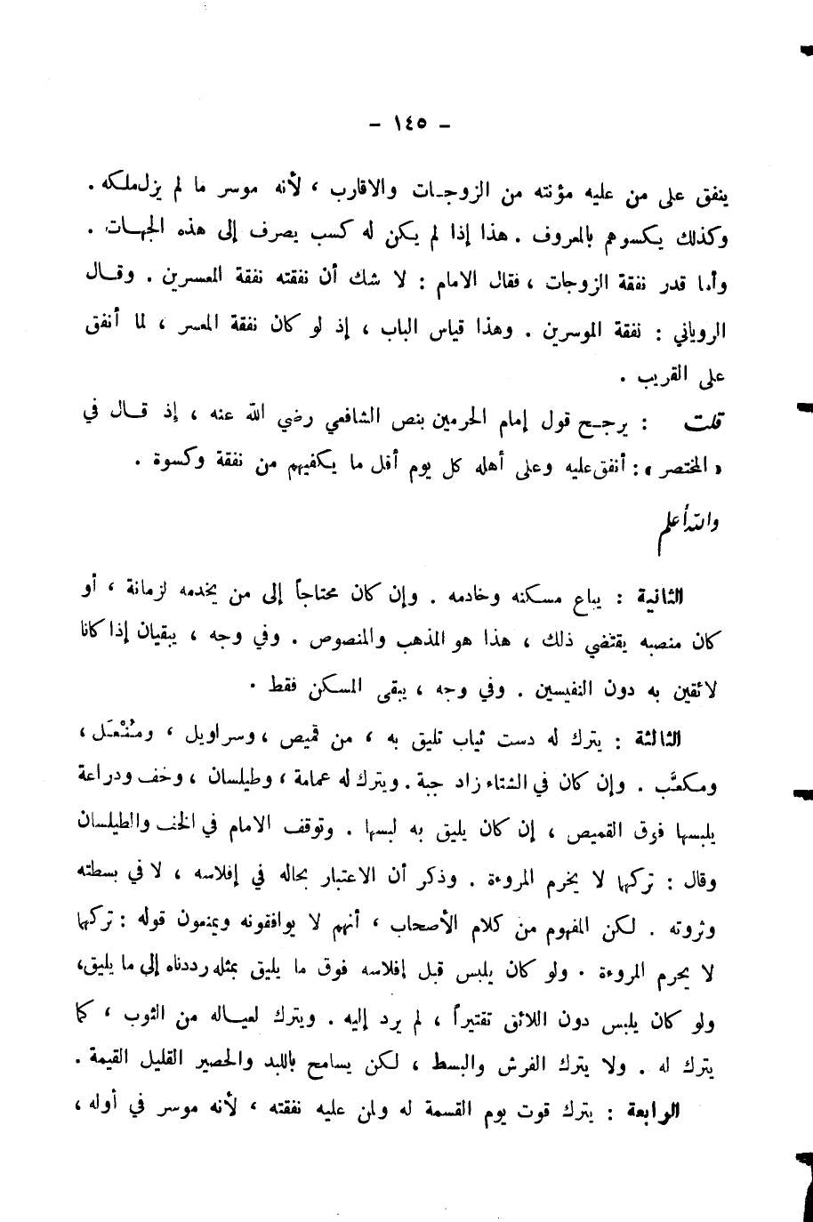 قُلْتُ: يُرَجَّحُ قَوْلُ إِمَامِ الْحَرَمَيْنِ بِنَصِّ الشَّافِعِيِّ رَضِيَ اللَّهُ عَنْهُ، إِذْ قَالَ فِي الْمُخْتَصَرِ: أُنْفِقَ عَلَيْهِ وَعَلَى أَهْلِهِ كُلَّ يَوْمٍ أَقَلَّ مَا يَكْفِيهِمْ مِنْ نَفَقَةٍ وَكُسْوَةٍ. وَاللَّهُ أَعْلَمُ.