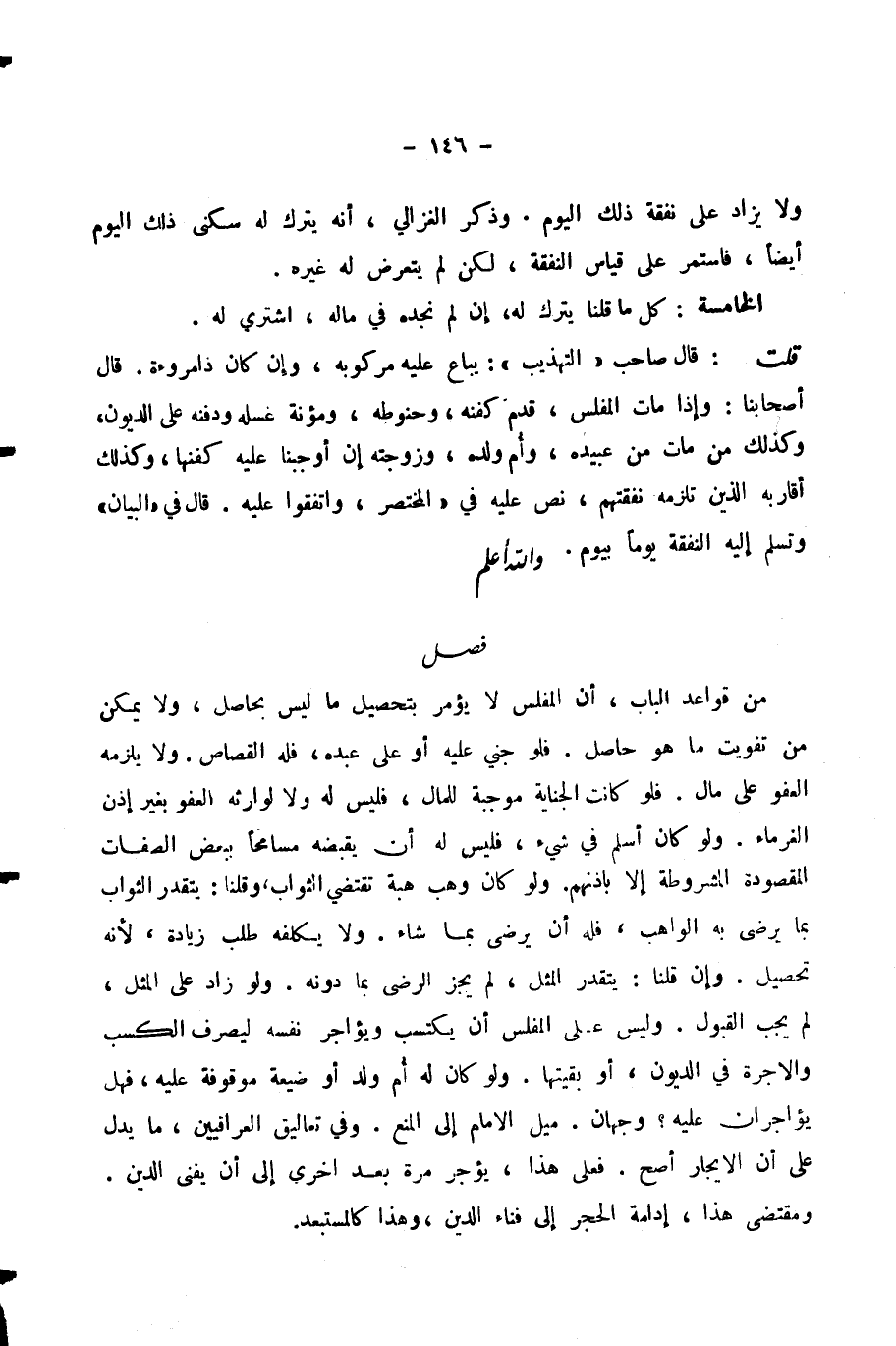 مِنْ قَوَاعِدِ الْبَابِ، أَنَّ الْمُفْلِسَ لَا يُؤْمَرُ بِتَحْصِيلِ مَا لَيْسَ بِحَاصِلٍ، وَلَا يُمَكَّنُ مِنْ تَفْوِيتِ مَا هُوَ حَاصِلٌ. فَلَوْ جُنِيَ عَلَيْهِ أَوْ عَلَى عَبْدِهِ، فَلَهُ الْقِصَاصُ. وَلَا يَلْزَمُهُ الْعَفْوُ عَلَى مَالٍ. فَلَوْ كَانَتِ الْجِنَايَةُ مُوجِبَةً لِلْمَالِ، فَلَيْسَ لَهُ وَلَا لِوَارِثِهِ الْعَفْوُ بِغَيْرِ إِذْنِ الْغُرَمَاءِ. وَلَوْ كَانَ أَسْلَمَ فِي شَيْءٍ، فَلَيْسَ لَهُ أَنْ يَقْبِضَهُ مُسَامِحًا بِبَعْضِ الصِّفَاتِ الْمَقْصُودَةِ الْمَشْرُوطَةِ إِلَّا بِإِذْنِهِمْ. وَلَوْ كَانَ وَهَبَ هِبَةً تَقْتَضِي الثَّوَابَ، وَقُلْنَا: يَتَقَدَّرُ الثَّوَابُ بِمَا يَرْضَى بِهِ الْوَاهِبُ، فَلَهُ أَنْ يَرْضَى بِمَا شَاءَ. وَلَا يُكَلِّفْهُ طَلَبُ زِيَادَةٍ ; لِأَنَّهُ تَحْصِيلٌ. وَإِنْ قُلْنَا: يَتَقَدَّرُ الْمِثْلُ لَمْ يَجُزِ الرِّضَى بِمَا دُونَهُ. وَلَوْ زَادَ عَلَى الْمِثْلِ لَمْ يَجِبِ الْقَبُولُ. وَلَيْسَ عَلَى الْمُفْلِسِ أَنْ يَكْتَسِبَ، وَيُؤَاجِرَ نَفْسَهُ لِيَصْرِفَ الْكَسْبَ، وَالْأُجْرَةَ فِي الدُّيُونِ أَوْ بَقِيَّتِهَا. وَلَوْ كَانَ لَهُ أُمُّ وَلَدٍ أَوْ صِيغَةٌ مَوْقُوفَةٌ عَلَيْهِ، فَهَلْ يُؤَاجَرَانِ عَلَيْهِ؟ وَجْهَانِ. مَيْلُ الْإِمَامِ إِلَى الْمَنْعِ. وَفِي تَعَالِيقِ الْعِرَاقِيِّينَ، مَا يَدُلُّ عَلَى أَنَّ الْإِيجَارَ أَصَحُّ. فَعَلَى هَذَا، يُؤَجَّرُ مَرَّةً بَعْدَ أُخْرَى إِلَى أَنْ يَفْنَى الدَّيْنُ. وَمُقْتَضَى هَذَا، إِدَامَةُ الْحَجْرِ إِلَى فَنَاءِ الدَّيْنِ، وَهَذَا كَالْمُسْتَبْعَدِ.
