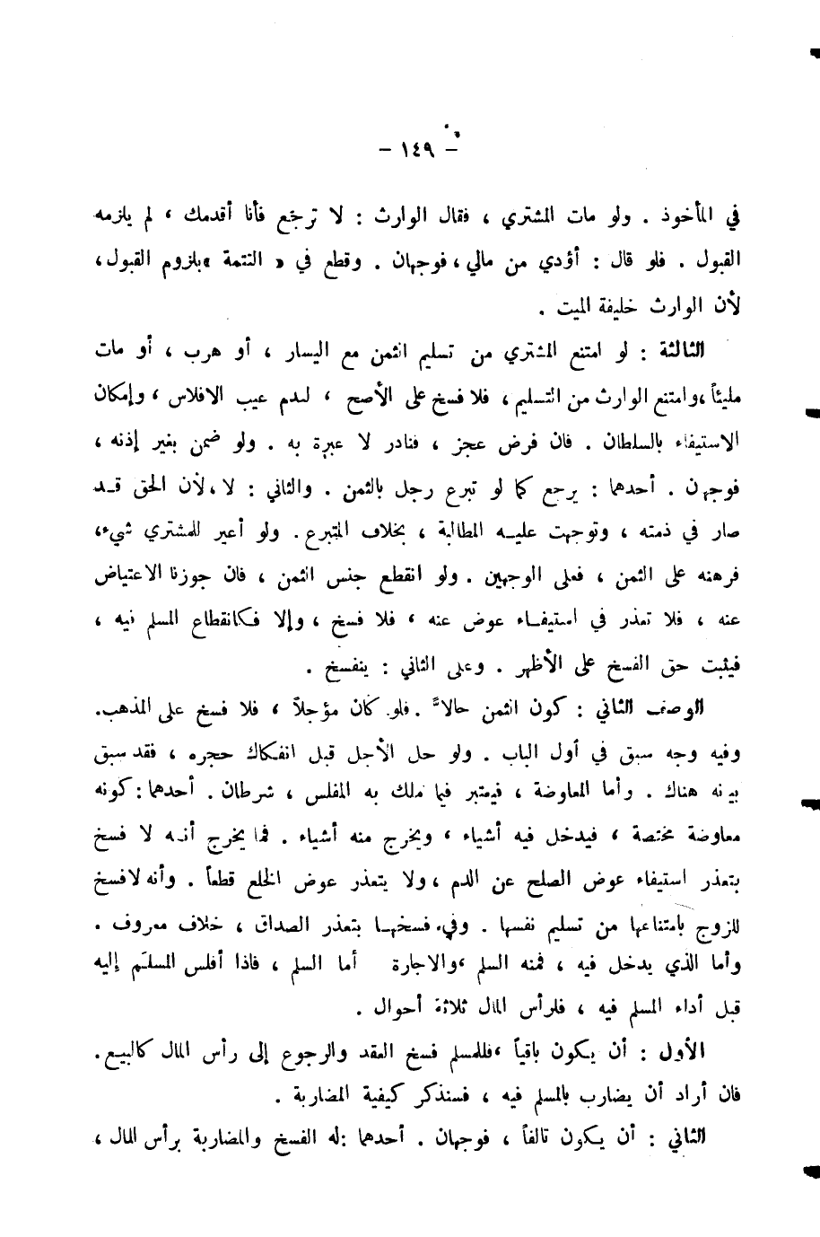 الْوَصْفُ الثَّانِي: كَوْنُ الثَّمَنِ حَالًّا. فَلَوْ كَانَ مُؤَجَّلًا، فَلَا فَسْخَ عَلَى الْمَذْهَبِ. وَفِيهِ وَجْهٌ سَبَقَ فِي أَوَّلِ الْبَابِ. وَلَوْ حَلَّ الْأَجَلُ قَبْلَ انْفِكَاكِ حَجْرِهِ، فَقَدْ سَبَقَ بَيَانُهُ هُنَاكَ وَأَمَّا الْمُعَاوَضَةُ، فَيُعْتَبَرُ فِيمَا مَلَكَ بِهِ الْمُفْلِسُ، شَرْطَانِ. أَحَدُهُمَا: كَوْنُهُ مُعَاوَضَةً مُخْتَصَّةً، فَيَدْخُلُ فِيهِ أَشْيَاءُ، وَيَخْرُجُ مِنْهُ أَشْيَاءُ. فَمَا يَخْرُجُ أَنَّهُ لَا فَسْخَ بِتَعَذُّرِ اسْتِيفَاءِ عِوَضِ الصُّلْحِ عَنِ الدَّمِ، وَلَا يَتَعَذَّرُ عِوَضُ الْخُلْعِ قَطْعًا. وَأَنَّهُ لَا فَسْخَ لِلزَّوْجِ بِامْتِنَاعِهَا مِنْ تَسْلِيمِ نَفْسِهَا. وَفِي فَسْخِهَا بِتَعَذُّرِ الصَّدَاقِ، خِلَافٌ مَعْرُوفٌ. وَأَمَّا الَّذِي يَدْخُلُ فِيهِ، فَمِنْهُ السَّلَمُ، وَالْإِجَارَةُ. أَمَّا السَّلَمُ، فَإِذَا أَفْلَسَ الْمُسْلَمُ إِلَيْهِ قَبْلَ أَدَاءِ الْمُسْلَمِ فِيهِ، فَلِرَأْسِ الْمَالِ ثَلَاثَةُ أَحْوَالٍ.