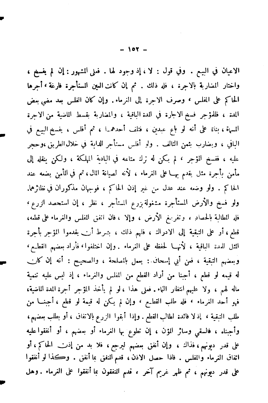الْأَعْيَانِ فِي الْبَيْعِ. وَفِي قَوْلٍ: لَا؛ إِذْ لَا وُجُودَ لَهَا. فَعَلَى الْمَشْهُورِ: إِنْ لَمْ يَفْسَخْ، وَاخْتَارَ الْمُضَارَبَةَ بِالْأُجْرَةِ فَلَهُ ذَلِكَ. ثُمَّ إِنْ كَانَتِ الْعَيْنُ الْمُسْتَأْجَرَةُ فَارِغَةً، أَجَّرَهَا الْحَاكِمُ عَلَى الْمُفْلِسِ، وَصَرَفَ الْأُجْرَةَ إِلَى الْغُرَمَاءِ. وَإِنْ كَانَ الْفَلَسُ بَعْدَ مُضِيِّ بَعْضِ الْمُدَّةِ فَلِلْمُؤَجِّرِ فَسْخُ الْإِجَارَةِ فِي الْمُدَّةِ الْبَاقِيَةِ، وَالْمُضَارَبَةُ بِقِسْطِ الْمَاضِيَةِ مِنَ الْأُجْرَةِ الْمُسَمَّاةِ، بِنَاءً عَلَى أَنَّهُ لَوْ بَاعَ عَبْدَيْنِ، فَتَلِفَ أَحَدُهُمَا، ثُمَّ أَفْلَسَ، يُفْسَخُ الْبَيْعُ فِي الْبَاقِي، وَيُضَارِبُ بِثَمَنِ التَّالِفِ. وَلَوْ أَفْلَسَ مُسْتَأْجِرُ الدَّابَّةِ فِي خِلَالِ الطَّرِيقِ، وَحُجِرَ عَلَيْهِ، فَفَسَخَ الْمُؤَجِّرُ لَمْ يَكُنْ لَهُ تَرْكُ مَتَاعِهِ فِي الْبَادِيَةِ الْمُهْلِكَةِ، وَلَكِنْ يَنْقُلُهُ إِلَى مَأْمَنٍ بِأُجْرَةِ مِثْلٍ يَقْدَمُ بِهَا عَلَى الْغُرَمَاءِ ; لِأَنَّهُ لِصِيَانَةِ الْمَالِ، ثُمَّ فِي الْمَأْمَنِ يَضَعُهُ عِنْدَ الْحَاكِمِ. وَلَوْ وَضَعَهُ عِنْدَ عَدْلٍ مِنْ غَيْرِ إِذْنِ الْحَاكِمِ، فَوَجْهَانِ مَذْكُورَانِ فِي نَظَائِرِهِمَا. وَلَوْ فَسَخَ وَالْأَرْضُ الْمُسْتَأْجَرَةُ مَشْغُولَةٌ بِزَرْعِ الْمُسْتَأْجِرِ، نُظِرَ إِنِ اسْتَحْصَدَ الزَّرْعَ فَلَهُ الْمُطَالَبَةُ بِالْحَصَادِ، وَتَفْرِيغِ الْأَرْضِ، وَإِلَّا فَإِنِ اتَّفَقَ الْمُفْلِسُ وَالْغُرَمَاءُ عَلَى قَطْعِهِ قُطِعَ أَوْ عَلَى التَّبْقِيَةِ إِلَى الْإِدْرَاكِ فَلَهُمْ ذَلِكَ، بِشَرْطِ أَنْ يُقَدِّمُوا الْمُؤَجِّرَ بِأُجْرَةِ الْمِثْلِ لِلْمُدَّةِ الْبَاقِيَةِ ; لِأَنَّهَا لِحِفْظِهِ عَلَى الْغُرَمَاءِ. وَإِنِ اخْتَلَفُوا، فَأَرَادَ بَعْضُهُمُ الْقَطْعَ، وَبَعْضُهُمُ التَّبْقِيَةَ، فَعَنْ أَبِي إِسْحَاقَ: يُعْمَلُ بِالْمَصْلَحَةِ، وَالصَّحِيحُ: أَنَّهُ إِنْ كَانَ لَهُ قِيمَةٌ قُطِعَ، أَجَبْنَا مَنْ أَرَادَ الْقَطْعَ مِنَ الْمُفْلِسِ وَالْغُرَمَاءِ، إِذْ لَيْسَ عَلَيْهِ تَنْمِيَةُ مَالِهِ لَهُمْ، وَلَا عَلَيْهِمُ انْتِظَارُ النَّمَاءِ. فَعَلَى هَذَا لَوْ لَمْ يَأْخُذِ الْمُؤَجِّرُ أُجْرَةَ الْمُدَّةِ الْمَاضِيَةِ، فَهُوَ أَحَدُ الْغُرَمَاءِ، فَلَهُ طَلَبُ الْقَطْعِ، وَإِنْ لَمْ يَكُنْ لَهُ قِيمَةٌ لَوْ قُطِعَ أَجَبْنَا مَنْ طَلَبَ التَّبْقِيَةَ، إِذْ لَا فَائِدَةَ لَطَالِبِ الْقَطْعِ. وَإِذَا أَبْقَوُا الزَّرْعَ بِالِاتِّفَاقِ، أَوْ بَطَلَبِ بَعْضِهِمْ، وَأَجَبْنَاهُ، فَالسَّقْيُ وَسَائِرُ الْمُؤَنِ إِنْ تَطَوَّعَ بِهَا الْغُرَمَاءُ أَوْ بَعْضُهُمْ، أَوْ أَنْفَقُوا عَلَيْهِ عَلَى قَدْرِ دُيُونِهِمْ فَذَاكَ، وَإِنْ أَنْفَقَ بَعْضُهُمْ لِيَرْجِعَ فَلَا بُدَّ مِنْ إِذْنِ الْحَاكِمِ، أَوِ اتِّفَاقِ الْغُرَمَاءِ وَالْمُفْلِسِ. فَإِذَا حَصَلَ الْإِذْنُ، قُدِّمَ الْمُنْفِقُ بِمَا أَنْفَقَ. وَكَذَا لَوْ أَنْفَقُوا عَلَى قَدْرِ دُيُونِهِمْ، ثُمَّ ظَهَرَ غَرِيمٌ آخَرُ، قُدِّمَ الْمُنْفِقُونَ بِمَا أَنْفَقُوا عَلَى الْغُرَمَاءِ. وَهَلْ