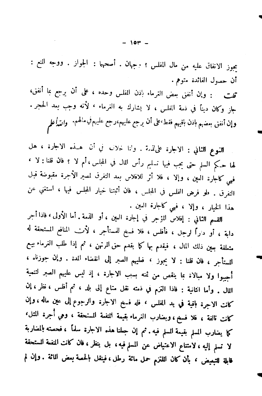 النَّوْعُ الثَّانِي: الْإِجَارَةُ عَلَى الذِّمَّةِ. وَلَنَا خِلَافٌ فِي أَنَّ هَذِهِ الْإِجَارَةَ، هَلْ لَهَا حُكْمُ السَّلَمِ حَتَّى يَجِبَ فِيهَا تَسْلِيمُ رَأْسِ الْمَالِ فِي الْمَجْلِسِ، أَمْ لَا؟ فَإِنْ قُلْنَا: لَا، فَهِيَ كَإِجَارَةِ الْعَيْنِ، وَإِلَّا فَلَا أَثَرَ لِلْإِفْلَاسِ بَعْدَ التَّفَرُّقِ لِمَصِيرِ الْأُجْرَةِ مَقْبُوضَةً قَبْلَ التَّفَرُّقِ. فَلَوْ فُرِضَ الْفَلَسُ فِي الْمَجْلِسِ، فَإِنْ أَثْبَتْنَا خِيَارَ الْمَجْلِسِ فِيهَا، اسْتُغْنِيَ عَنْ هَذَا الْخِيَارِ، وَإِلَّا، فَهِيَ كَإِجَارَةِ الْعَيْنِ.