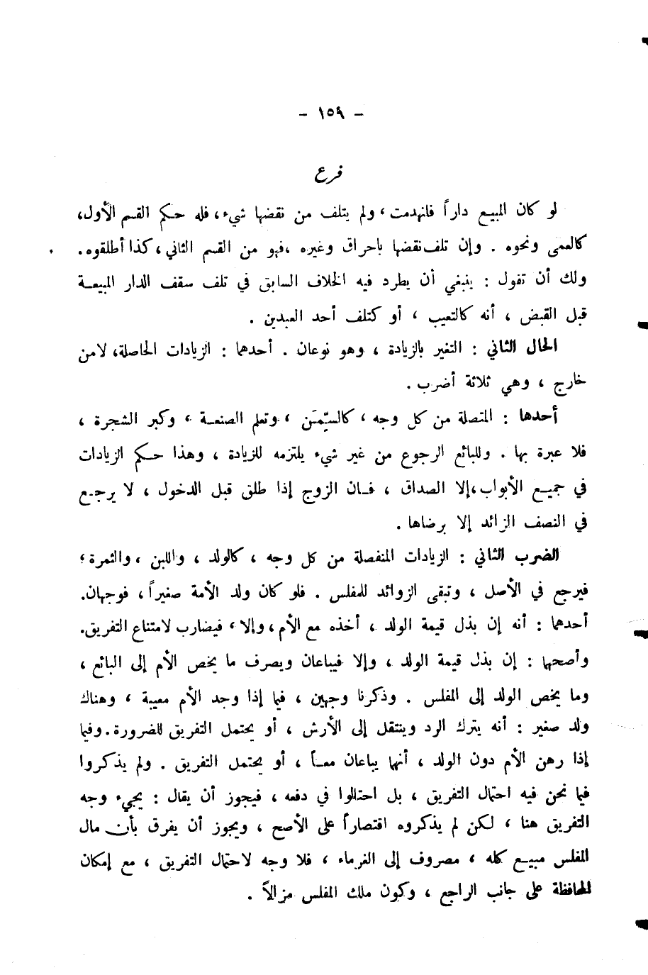 الضَّرْبُ الثَّانِي: الزِّيَادَاتُ الْمُنْفَصِلَةُ مِنْ كُلِّ وَجْهٍ، كَالْوَلَدِ، وَاللَّبَنِ، وَالثَّمَرَةِ، فَيَرْجِعُ فِي الْأَصْلِ، وَتَبْقَى الزَّوَائِدُ لِلْمُفْلِسِ. فَلَوْ كَانَ وَلَدُ الْأَمَةِ صَغِيرًا، فَوَجْهَانِ. أَحَدُهُمَا: أَنَّهُ إِنْ بَذَلَ قِيمَةَ الْوَلَدِ، أَخَذَهُ مَعَ الْأُمِّ، وَإِلَّا، فَيُضَارُّ لِامْتِنَاعِ التَّفْرِيقِ. وَأَصَحُّهُمَا: إِنْ بَذَلَ قِيمَةَ الْوَلَدِ، وَإِلَّا فَيُبَاعَانِ وَيُصْرَفُ مَا يَخُصُّ الْأُمَّ إِلَى الْبَائِعِ، وَمَا يَخُصُّ الْوَلَدَ إِلَى الْمُفْلِسِ. وَذَكَرْنَا وَجْهَيْنِ، فِيمَا إِذَا وَجَدَ الْأُمَّ مَعِيبَةً، وَهُنَاكَ وَلَدٌ صَغِيرٌ: أَنَّهُ الرَّدُّ وَيَنْتَقِلُ إِلَى الْأَرْشِ، أَوْ يَحْتَمِلُ التَّفْرِيقَ لِلضَّرُورَةِ. وَفِيمَا إِذَا رَهَنَ الْأُمَّ دُونَ الْوَلَدِ، أَنَّهُمَا يُبَاعَانِ مَعًا، أَوْ يُحْتَمَلُ التَّفْرِيقُ. وَلَمْ يَذْكُرُوا فِيمَا نَحْنُ فِيهِ احْتِمَالَ التَّفْرِيقِ، بَلِ احْتَالُوا فِي دَفْعِهِ، فَيَجُوزُ أَنْ يُقَالَ: يَجِيءُ وَجْهُ التَّفْرِيقِ هُنَا، لَكِنْ لَمْ يَذْكُرُوهُ اقْتِصَارًا عَلَى الْأَصَحِّ، وَيَجُوزُ أَنْ يُفَرَّقَ بِأَنَّ مَالَ الْمُفْلِسِ مَبِيعٌ كُلُّهُ، مَصْرُوفٌ إِلَى الْغُرَمَاءِ، فَلَا وَجْهَ لِاحْتِمَالِ التَّفْرِيقِ، مَعَ إِمْكَانِ الْمُحَافَظَةِ عَلَى جَانِبِ الرَّاجِعِ، وَكَوْنِ مِلْكِ الْمُفْلِسِ مُزَالًا.
