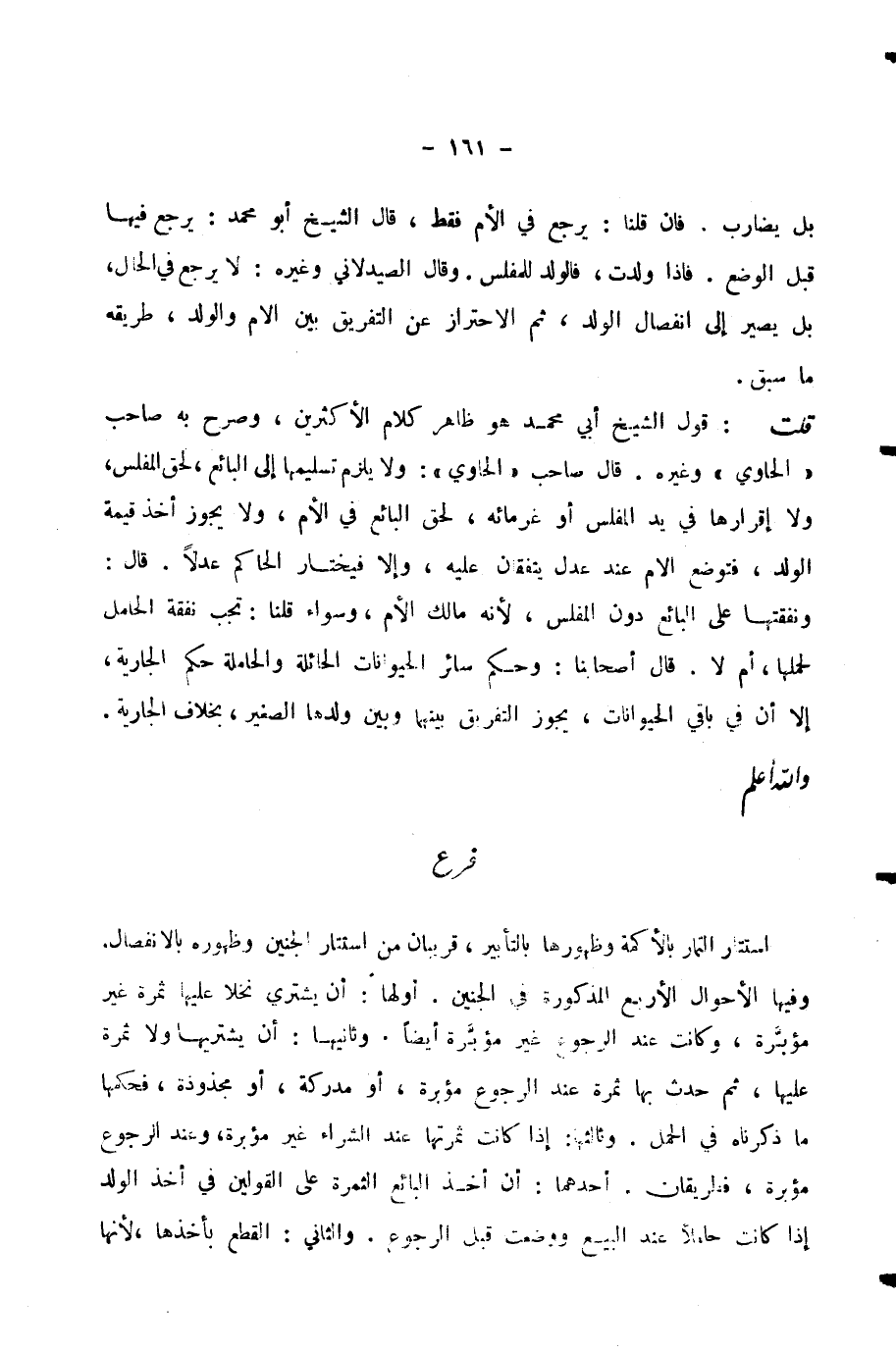 قُلْتُ: قَوْلُ الشَّيْخِ أَبِي مُحَمَّدٍ هُوَ ظَاهِرُ كَلَامِ الْأَكْثَرِينَ، وَصَرَّحَ بِهِ صَاحِبُ الْحَاوِي وَغَيْرُهُ. قَالَ صَاحِبُ الْحَاوِي: وَلَا يَلْزَمُ تَسْلِيمُهَا إِلَى الْبَائِعِ، لِحَقِّ الْمُفْلِسِ، وَلَا إِقْرَارُهَا فِي يَدِ الْمُفْلِسِ أَوْ غُرَمَائِهِ، لِحَقِّ الْبَائِعِ فِي الْأُمِّ، وَلَا يَجُوزُ أَخْذُ قِيمَةِ الْوَلَدِ، فَتُوضَعُ الْأُمُّ عِنْدَ عَدْلٍ يَتَّفِقَانِ عَلَيْهِ، وَإِلَّا فَيَخْتَارُ الْحَاكِمُ عَدْلًا. قَالَ: وَنَفَقَتُهَا عَلَى الْبَائِعِ دُونَ الْمُفْلِسِ ; لِأَنَّهُ مَالِكُ الْأُمِّ، وَسَوَاءٌ قُلْنَا: تَجِبُ نَفَقَةُ الْحَامِلِ لِحَمْلِهَا، أَمْ لَا. قَالَ أَصْحَابُنَا: وَحُكْمُ سَائِرِ الْحَيَوَانَاتِ الْحَائِلَةِ وَالْحَامِلَةِ حُكْمُ الْجَارِيَةِ، إِلَّا أَنَّ فِي بَاقِي الْحَيَوَانَاتِ، يَجُوزُ التَّفْرِيقُ بَيْنَهُمَا وَبَيْنَ وَلَدِهَا الصَّغِيرِ، بِخِلَافِ الْجَارِيَةِ. وَاللَّهُ أَعْلَمُ.