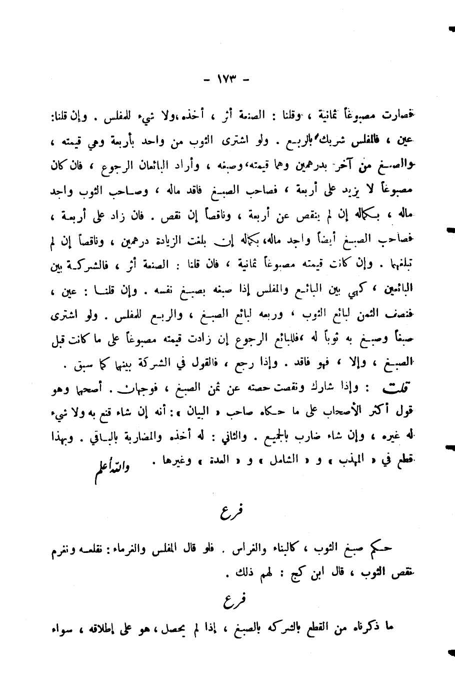 قُلْتُ: وَإِذَا شَارَكَ وَنَقَصَتْ حِصَّتُهُ عَنْ ثَمَنِ الصِّبْغِ، فَوَجْهَانِ. أَصَحُّهُمَا وَهُوَ قَوْلُ أَكْثَرِ الْأَصْحَابِ عَلَى مَا حَكَاهُ صَاحِبُ «الْبَيَانِ» : أَنَّهُ إِنْ شَاءَ قَنِعَ بِهِ وَلَا شَيْءَ لَهُ غَيْرُهُ، وَإِنْ شَاءَ ضَارَبَ بِالْجَمِيعِ. وَالثَّانِي: لَهُ أَخْذُهُ وَالْمُضَارَبَةُ بِالْبَاقِي. وَبِهَذَا قَطَعَ فِي «الْمُهَذَّبِ» وَ «الشَّامِلِ» وَالْعُدَّةِ وَغَيْرِهَا. - وَاللَّهُ أَعْلَمُ -.