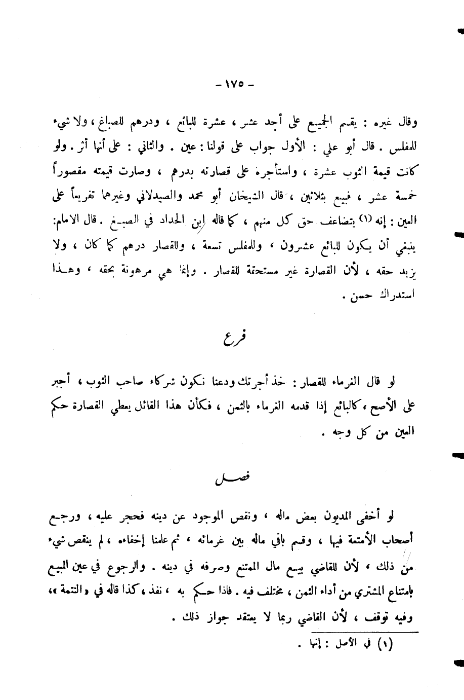 وَقَالَ غَيْرُهُ يُقَسَّمُ الْجَمِيعُ عَلَى أَحَدَ عَشَرَ، عَشَرَةٌ لِلْبَائِعِ، وَدِرْهَمٌ لِلصَّبَّاغِ، وَلَا شَيْءَ لِلْمُفْلِسِ. قَالَ أَبُو عَلِيٍّ: الْأَوَّلُ جَوَابٌ عَلَى قَوْلِنَا: عَيْنٌ. وَالثَّانِي: عَلَى أَنَّهَا أَثَرٌ. وَلَوْ كَانَتْ قِيمَةُ الثَّوْبِ عَشَرَةً، وَاسْتَأْجَرَهُ عَلَى قِصَارَتِهِ بِدِرْهَمٍ، وَصَارَتْ قِيمَتُهُ مَقْصُورًا خَمْسَةَ عَشَرَ، فَبِيعَ بِثَلَاثِينَ، قَالَ الشَّيْخَانِ أَبُو مُحَمَّدٍ وَالصَّيْدَلَانِيُّ وَغَيْرُهُمَا تَفْرِيعًا عَلَى الْعَيْنِ: إِنَّهُ يَتَضَاعَفُ حَقُّ كُلٍّ مِنْهُمْ، كَمَا قَالَهُ ابْنُ الْحَدَّادِ فِي الصَّبْغِ. قَالَ الْإِمَامُ: يَنْبَغِي أَنْ يَكُونَ لِلْبَائِعِ عِشْرُونَ، وَلِلْمُفْلِسِ تِسْعَةٌ، وَلِلْقَصَّارِ دِرْهَمٌ كَمَا كَانَ، وَلَا يَزِيدُ حَقُّهُ؛ لِأَنَّ الْقِصَارَةَ غَيْرُ مُسْتَحَقَّةٍ لِلْقَصَّارِ. وَإِنَّمَا هِيَ مَرْهُونَةٌ بِحَقِّهِ، وَهَذَا اسْتِدْرَاكٌ حَسَنٌ.