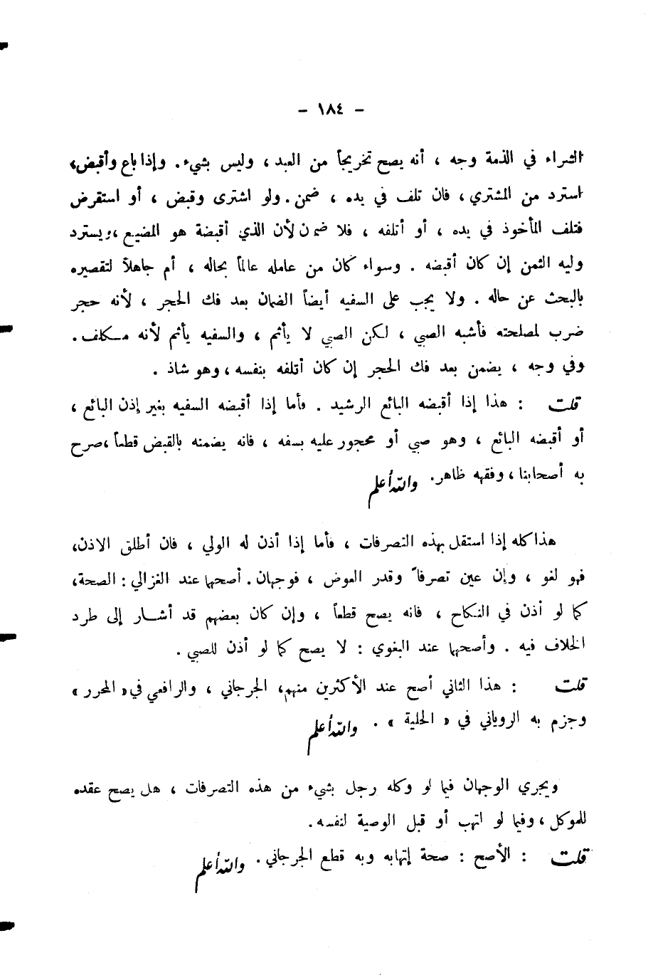الشِّرَاءِ فِي الذِّمَّةِ وَجْهٌ، أَنَّهُ يَصِحُّ تَخْرِيجًا مِنَ الْعَبْدِ، وَلَيْسَ بِشَيْءٍ. وَإِذَا بَاعَ وَأَقْبَضَ، اسْتَرَدَّ مِنَ الْمُشْتَرِي، فَإِنْ تَلِفَ فِي يَدِهِ، ضَمِنَ. وَلَوِ اشْتَرَى وَقَبَضَ، أَوِ اسْتَقْرَضَ فَتَلِفَ الْمَأْخُوذُ فِي يَدِهِ، أَوْ أَتْلَفَهُ، فَلَا ضَمَانَ لِأَنَّ الَّذِي أَقْبَضَهُ هُوَ الْمُضَيِّعُ، وَيَسْتَرِدُّ وَلِيُّهُ الثَّمَنَ إِنْ كَانَ أَقْبَضَهُ. وَسَوَاءٌ كَانَ مَنْ عَامَلَهُ عَالِمًا بِحَالِهِ، أَمْ جَاهِلًا لِتَقْصِيرِهِ بِالْبَحْثِ عَنْ حَالِهِ. وَلَا يَجِبُ عَلَى السَّفِيهِ أَيْضًا الضَّمَانُ بَعْدَ فَكِّ الْحَجْرِ؛ لِأَنَّهُ حَجْرٌ ضُرِبَ لِمَصْلَحَتِهِ فَأَشْبَهَ الصَّبِيَّ، لَكِنَّ الصَّبِيَّ لَا يَأْثَمُ، وَالسَّفِيهُ يَأْثَمُ لِأَنَّهُ مُكَلَّفٌ. وَفِي وَجْهٍ، يَضْمَنُ بَعْدَ فَكِّ الْحَجْرِ إِنْ كَانَ أَتْلَفَهُ بِنَفْسِهِ، وَهُوَ شَاذٌّ.