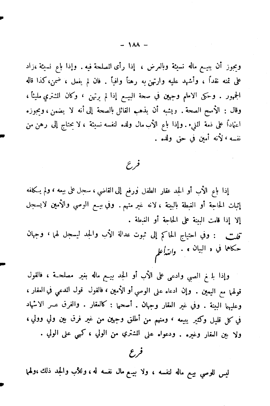 إِذَا بَاعَ الْأَبُ أَوِ الْجَدُّ عَقَارَ الطِّفْلِ وَرُفِعَ إِلَى الْقَاضِي، سَجَّلَ عَلَى بَيْعِهِ، وَلَمْ يُكَلِّفْهُ إِثْبَاتَ الْحَاجَةِ أَوِ الْغِبْطَةِ بِالْبَيِّنَةِ؛ لِأَنَّهُ غَيْرُ مُتَّهَمٍ. وَفِي بَيْعِ الْوَصِيِّ وَالْأَمِينِ لَا يُسَجَّلُ إِلَّا إِذَا قَامَتِ الْبَيِّنَةُ عَلَى الْحَاجَةِ أَوِ الْغِبْطَةِ.