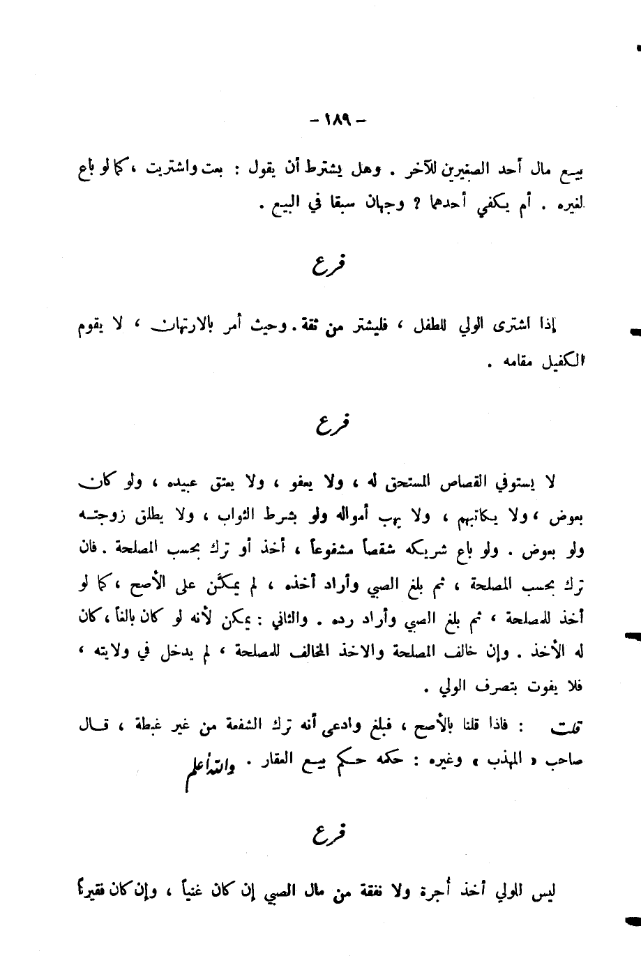 لَا يَسْتَوْفِي الْقِصَاصَ الْمُسْتَحَقَّ لَهُ، وَلَا يَعْفُو، وَلَا يُعْتِقُ عَبِيدَهُ، وَلَوْ كَانَ بِعِوَضٍ، وَلَا يُكَاتِبُهُمْ، وَلَا يَهِبُ أَمْوَالَهُ وَلَوْ بِشَرْطِ الثَّوَابِ، وَلَا يُطَلِّقُ زَوْجَتَهُ وَلَوْ بِعِوَضٍ. وَلَوْ بَاعَ شَرِيكُهُ شِقْصًا مَشْفُوعًا، أَخَذَ أَوْ تَرَكَ بِحَسَبِ الْمَصْلَحَةِ. فَإِنْ تَرَكَ بِحَسَبِ الْمَصْلَحَةِ، ثُمَّ بَلَغَ الصَّبِيُّ وَأَرَادَ أَخْذَهُ، لَمْ يُمَكَّنْ عَلَى الْأَصَحِّ، كَمَا لَوْ أَخَذَ لِلْمَصْلَحَةِ، ثُمَّ بَلَغَ الصَّبِيُّ وَأَرَادَ رَدَّهُ. وَالثَّانِي: يُمَكَّنُ لِأَنَّهُ لَوْ كَانَ بَالِغًا، كَانَ لَهُ الْأَخْذُ. وَإِنْ خَالَفَ الْمَصْلَحَةَ وَالْأَخْذَ الْمُخَالِفَ لِلْمَصْلَحَةِ، لَمْ يَدْخُلْ فِي وِلَايَتِهِ، فَلَا يَفُوتُ بِتَصَرُّفِ الْوَلِيِّ.