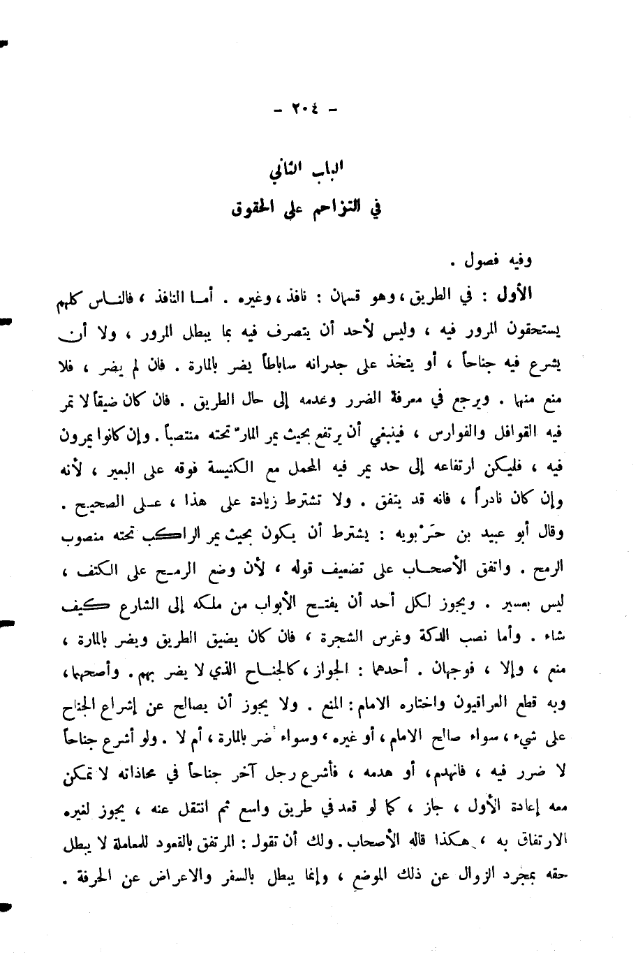 الْأَوَّلُ: فِي الطَّرِيقِ، وَهُوَ قِسْمَانِ: نَافِذٌ، وَغَيْرُهُ. أَمَّا النَّافِذُ، فَالنَّاسُ كُلُّهُمْ يَسْتَحِقُّونَ الْمُرُورَ فِيهِ، وَلَيْسَ لِأَحَدٍ أَنْ يَتَصَرَّفَ فِيهِ بِمَا يُبْطِلُ الْمُرُورَ، وَلَا أَنْ يَشْرَعَ فِيهِ جَنَاحًا، أَوْ يَتَّخِذَ عَلَى جُدْرَانِهِ سَابَاطًا يَضُرُّ بِالْمَارَّةِ. فَإِنْ لَمْ يَضُرَّ، فَلَا مَنْعَ مِنْهُمَا. وَيُرْجَعُ فِي مَعْرِفَةِ الضَّرَرِ وَعَدَمِهِ إِلَى حَالِ الطَّرِيقِ. فَإِنْ كَانَ ضَيِّقًا لَا تَمُرُّ فِيهِ الْقَوَافِلُ وَالْفَوَارِسُ، فَيَنْبَغِي أَنْ يَرْتَفِعَ بِحَيْثُ يَمُرُّ الْمَارُّ تَحْتَهُ مُنْتَصِبًا. وَإِنْ كَانُوا يَمُرُّونَ فِيهِ، فَلْيَكُنِ ارْتِفَاعُهُ إِلَى حَدٍّ يَمُرُّ فِيهِ الْمَحْمَلُ مَعَ الْكَنِيسَةِ فَوْقَهُ عَلَى الْبَعِيرِ؛ لِأَنَّهُ وَإِنْ كَانَ نَادِرًا، فَإِنَّهُ قَدْ يَتَّفِقُ. وَلَا تُشْتَرَطُ زِيَادَةٌ عَلَى هَذَا، عَلَى الصَّحِيحِ. وَقَالَ أَبُو عُبَيْدِ بْنُ حَرْبَوَيْهِ: يُشْتَرَطُ أَنْ يَكُونَ بِحَيْثُ يَمُرُّ الرَّاكِبُ تَحْتَهُ مَنْصُوبَ الرُّمْحِ. وَاتَّفَقَ الْأَصْحَابُ عَلَى تَضْعِيفِ قَوْلِهِ؛ لِأَنَّ وَضْعَ الرُّمْحِ عَلَى الْكَتِفِ، لَيْسَ بِعَسِيرٍ. وَيَجُوزُ لِكُلِّ أَحَدٍ أَنْ يَفْتَحَ الْأَبْوَابَ مِنْ مِلْكِهِ إِلَى الشَّارِعِ كَيْفَ شَاءَ. وَأَمَّا نَصْبُ الدِّكَّةِ وَغَرْسُ الشَّجَرَةِ، فَإِنْ كَانَ يُضَيِّقُ الطَّرِيقَ وَيَضُرُّ بِالْمَارَّةِ، مُنِعَ، وَإِلَّا فَوَجْهَانِ. أَحَدُهُمَا: الْجَوَازُ، كَالْجَنَاحِ الَّذِي لَا يَضُرُّ بِهِمْ. وَأَصَحُّهُمَا، وَبِهِ قَطَعَ الْعِرَاقِيُّونَ وَاخْتَارَهُ الْإِمَامُ: الْمَنْعُ. وَلَا يَجُوزُ أَنْ يُصَالِحَ عَنْ إِشْرَاعِ الْجَنَاحِ عَلَى شَيْءٍ، سَوَاءٌ صَالَحَ الْإِمَامَ أَوْ غَيْرَهُ، وَسَوَاءٌ ضَرَّ بِالْمَارَّةِ أَمْ لَا. وَلَوْ أَشْرَعَ جَنَاحًا لَا ضَرَرَ فِيهِ، فَانْهَدَمَ، أَوْ هَدَمَهُ، فَأَشْرَعَ رَجُلٌ آخَرُ جَنَاحًا فِي مُحَاذَاتِهِ لَا تُمْكِنُ مَعَهُ إِعَادَةُ الْأَوَّلِ، جَازَ، كَمَا لَوْ قَعَدَ فِي طَرِيقٍ وَاسِعٍ ثُمَّ انْتَقَلَ عَنْهُ، يَجُوزُ لِغَيْرِهِ الِارْتِفَاقُ بِهِ، هَكَذَا قَالَهُ الْأَصْحَابُ. وَلَكَ أَنْ تَقُولَ: الْمُرْتَفَقُ بِالْقُعُودِ لِلْمُعَامَلَةِ لَا يَبْطُلُ حَقُّهُ بِمُجَرَّدِ الزَّوَالِ عَنْ ذَلِكَ الْمَوْضِعِ، وَإِنَّمَا يَبْطُلُ بِالسَّفَرِ وَالْإِعْرَاضِ عَنِ الْحِرْفَةِ.