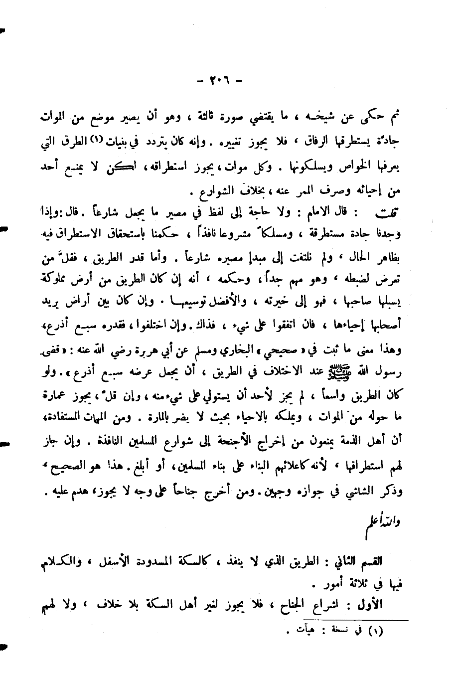 قُلْتُ: قَالَ الْإِمَامُ: وَلَا حَاجَةَ إِلَى لَفْظٍ فِي مَصِيرِ مَا يُجْعَلُ شَارِعًا. قَالَ: وَإِذَا وَجَدْنَا جَادَّةً مُسْتَطْرَقَةً، وَمَسْلَكًا مَشْرُوعًا نَافِذًا، حَكَمْنَا بِاسْتِحْقَاقِ الِاسْتِطْرَاقِ فِيهِ بِظَاهِرِ الْحَالِ، وَلَمْ نَلْتَفِتْ إِلَى مَبْدَإِ مَصِيرِهِ شَارِعًا. وَأَمَّا قَدْرُ الطَّرِيقِ، فَقَلَّ مَنْ تَعَرَّضَ لِضَبْطِهِ، وَهُوَ مُهِمٌّ جِدًّا، وَحُكْمُهُ، أَنَّهُ إِنْ كَانَ الطَّرِيقُ مِنْ أَرْضٍ مَمْلُوكَةٍ يُسَبِّلُهَا صَاحِبُهَا، فَهُوَ إِلَى خَيْرَتِهِ، وَالْأَفْضَلُ تَوْسِيعُهَا. وَإِنْ كَانَ بَيْنَ أَرَاضٍ يُرِيدُ أَصْحَابُهَا إِحْيَاءَهَا، فَإِنِ اتَّفَقُوا عَلَى شَيْءٍ، فَذَاكَ. وَإِنِ اخْتَلَفُوا، فَقَدْرُهُ سَبْعُ أَذْرُعٍ، وَهَذَا مَعْنَى مَا ثَبَتَ فِي «صَحِيحَيِ» الْبُخَارِيِّ وَمُسْلِمٍ عَنْ أَبِي هُرَيْرَةَ - رَضِيَ اللَّهُ عَنْهُ -: قَضَى رَسُولُ اللَّهِ - صَلَّى اللَّهُ عَلَيْهِ وَسَلَّمَ - عِنْدَ الِاخْتِلَافِ فِي الطَّرِيقِ، أَنْ يُجْعَلَ عَرْضُهُ سَبْعَ أَذْرُعٍ. وَلَوْ كَانَ الطَّرِيقُ وَاسِعًا، لَمْ يَجُزْ لِأَحَدٍ أَنْ يَسْتَوْلِيَ عَلَى شَيْءٍ مِنْهُ، وَإِنْ قَلَّ، يَجُوزُ عِمَارَةُ مَا حَوْلَهُ مِنَ الْمَوَاتِ، وَيَمْلِكُهُ بِالْإِحْيَاءِ بِحَيْثُ لَا يَضُرُّ بِالْمَارَّةِ. وَمِنَ الْمُهِمَّاتِ الْمُسْتَفَادَةِ، أَنَّ أَهْلَ الذِّمَّةِ يُمْنَعُونَ مِنْ إِخْرَاجِ الْأَجْنِحَةِ إِلَى شَوَارِعِ الْمُسْلِمِينَ النَّافِذَةِ. وَإِنْ جَازَ لَهُمُ اسْتِطْرَاقُهَا؛ لِأَنَّهُ كَإِعْلَائِهِمُ الْبِنَاءَ عَلَى بِنَاءِ الْمُسْلِمِينَ، أَوْ أَبْلَغُ. هَذَا هُوَ الصَّحِيحُ، وَذَكَرَ الشَّاشِيُّ فِي جَوَازِهِ وَجْهَيْنِ. وَمَنْ أَخْرَجَ جَنَاحًا عَلَى وَجْهٍ لَا يَجُوزُ، هُدِمَ عَلَيْهِ. - وَاللَّهُ أَعْلَمُ -.