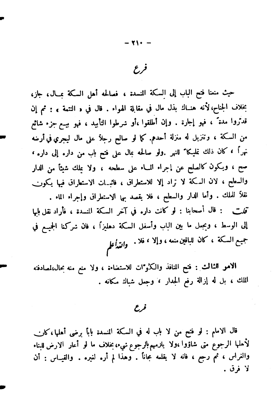 حَيْثُ مَنَعْنَا فَتْحَ الْبَابِ إِلَى السِّكَّةِ الْمُنْسَدَّةِ، فَصَالَحَهُ أَهْلُ السِّكَّةِ بِمَالٍ جَازَ، بِخِلَافِ الْجَنَاحِ؛ لِأَنَّهُ هُنَاكَ بَذْلُ مَالٍ فِي مُقَابَلَةِ الْهَوَاءِ. قَالَ فِي «التَّتِمَّةِ» : ثُمَّ إِنْ قَدَّرُوا مُدَّةً، فَهُوَ إِجَارَةٌ. وَإِنْ أَطْلَقُوا، أَوْ شَرَطُوا التَّأْبِيدَ، فَهُوَ بَيْعُ جُزْءٍ شَائِعٍ مِنَ السِّكَّةِ، وَتَنْزِيلٌ لَهُ مَنْزِلَةَ أَحَدِهِمْ. كَمَا لَوْ صَالَحَ رَجُلًا عَلَى مَالٍ لِيُجْرِيَ فِي أَرْضِهِ نَهْرًا، كَانَ ذَلِكَ تَمْلِيكًا لِلنَّهْرِ. وَلَوْ صَالَحَهُ بِمَالٍ عَلَى فَتْحِ بَابٍ مِنْ دَارِهِ إِلَى دَارِهِ، صَحَّ، وَيَكُونُ كَالصُّلْحِ عَنْ إِجْرَاءِ الْمَاءِ عَلَى سَطْحِهِ، وَلَا يَمْلِكُ شَيْئًا مِنَ الدَّارِ وَالسَّطْحِ؛ لِأَنَّ السِّكَّةَ لَا تُرَادُ إِلَّا لِلِاسْتِطْرَاقِ، فَإِثْبَاتُ الِاسْتِطْرَاقِ فِيهَا يَكُونُ نَقْلًا لِلْمِلْكِ.