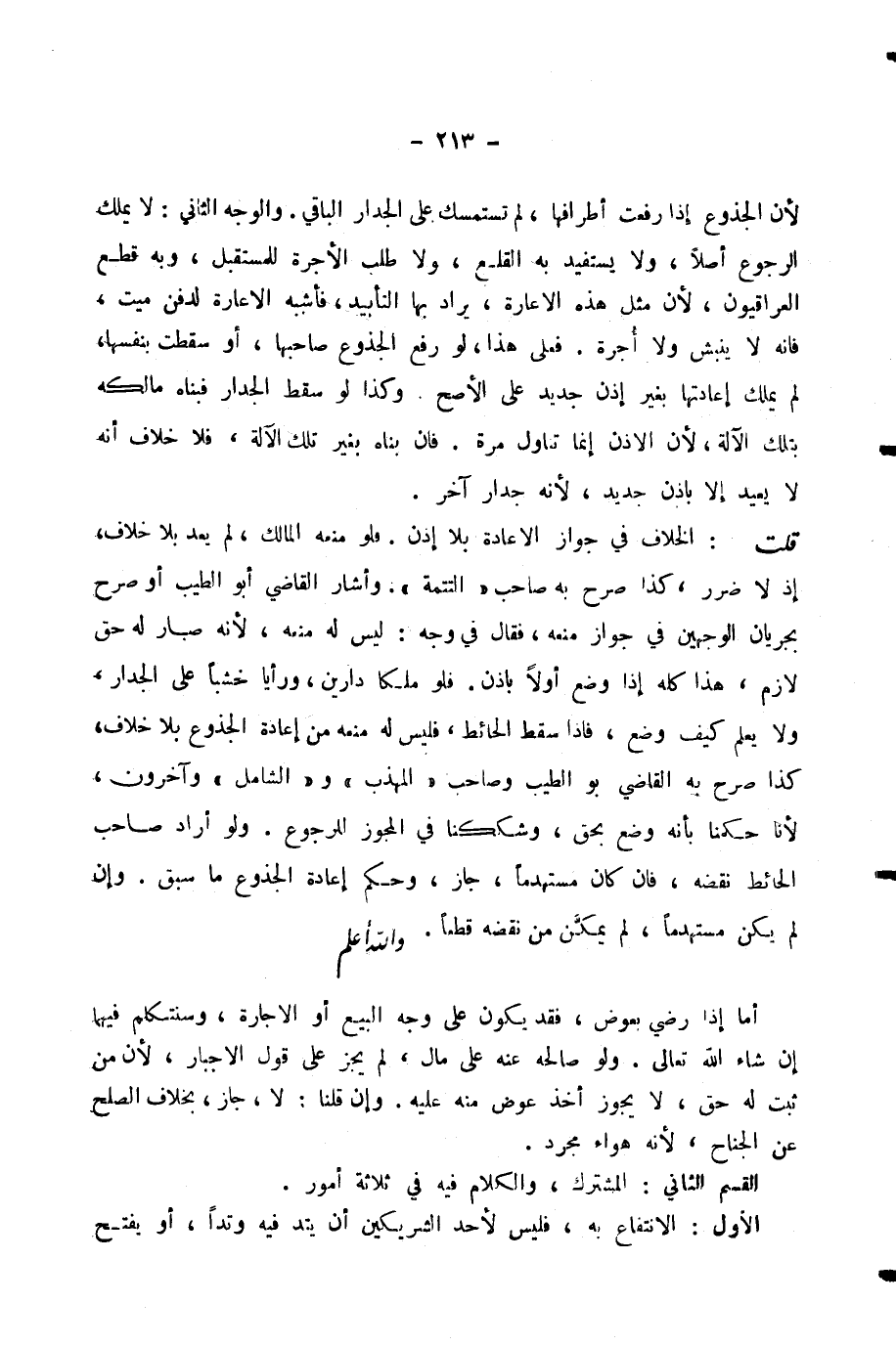 قُلْتُ: الْخِلَافُ فِي جَوَازِ الْإِعَادَةِ بِلَا إِذْنٍ. فَلَوْ مَنَعَهُ الْمَالِكُ، لَمْ يُعِدْ بِلَا خِلَافٍ، إِذْ لَا ضَرَرَ، كَذَا صَرَّحَ بِهِ صَاحِبُ «التَّتِمَّةِ» . وَأَشَارَ الْقَاضِي أَبُو الطَّيِّبِ أَوْ صَرَّحَ بِجَرَيَانِ الْوَجْهَيْنِ فِي جَوَازِ مَنْعِهِ، فَقَالَ فِي وَجْهٍ: لَيْسَ لَهُ مَنْعُهُ لِأَنَّهُ صَارَ لَهُ حَقٌّ لَازِمٌ، هَذَا كُلُّهُ إِذَا وُضِعَ أَوَّلًا بِإِذْنٍ. فَلَوْ مُلِّكَا دَارَيْنِ، وَرَأَيَا خَشَبًا عَلَى الْجِدَارِ، وَلَا يُعْلَمُ كَيْفَ وُضِعَ، فَإِذَا سَقَطَ الْحَائِطُ، فَلَيْسَ لَهُ مَنْعُهُ، مِنْ إِعَادَةِ الْجُذُوعِ بِلَا خِلَافٍ، كَذَا صَرَّحَ بِهِ الْقَاضِي أَبُو الطَّيِّبِ وَصَاحِبُ «الْمُهَذَّبِ» وَ «الشَّامِلِ» وَآخَرُونَ، لِأَنَّا حَكَمْنَا بِأَنَّهُ وُضِعَ بِحَقٍّ، وَشَكَكْنَا فِي الْمُجَوِّزِ لِلرُّجُوعِ. وَلَوْ أَرَادَ صَاحِبُ الْحَائِطِ نَقْضَهُ، فَإِنْ كَانَ مُسْتَهْدَمًا، جَازَ، وَحُكْمُ إِعَادَةِ الْجُذُوعِ مَا سَبَقَ. وَإِنْ لَمْ يَكُنْ مُسْتَهْدَمًا، لَمْ يُمَكَّنْ مِنْ نَقْضِهِ قَطْعًا. - وَاللَّهُ أَعْلَمُ -.