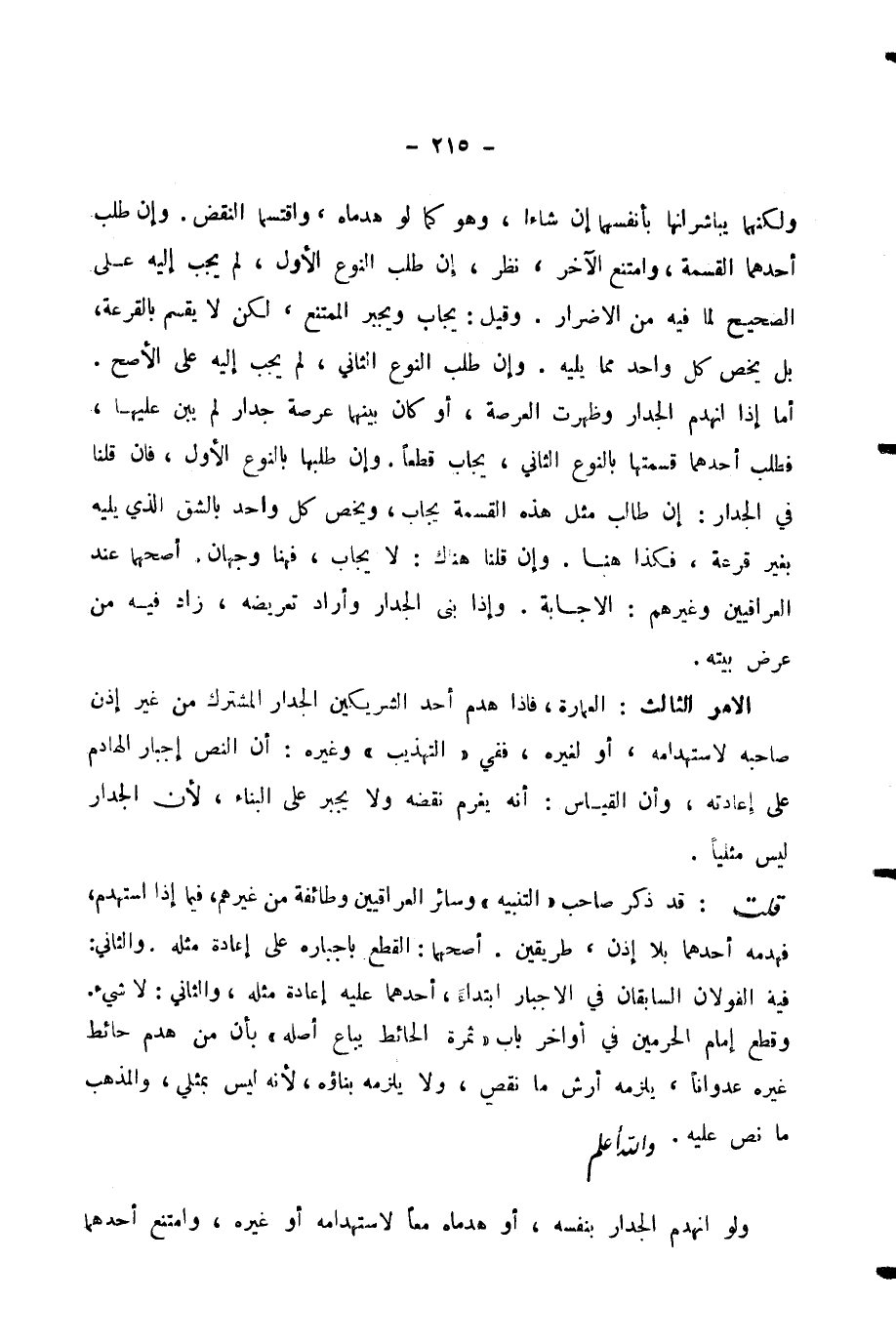 الْأَمْرُ الثَّالِثُ: الْعِمَارَةُ، فَإِذَا هَدَمَ أَحَدُ الشَّرِيكَيْنِ الْجِدَارَ الْمُشْتَرَكِ مِنْ غَيْرِ إِذْنِ صَاحِبِهِ لِاسْتِهْدَامِهِ، أَوْ لِغَيْرِهِ، فَفِي «التَّهْذِيبِ» وَغَيْرِهِ: أَنَّ النَّصَّ إِجْبَارُ الْهَادِمِ عَلَى إِعَادَتِهِ، وَأَنَّ الْقِيَاسَ: أَنَّهُ يُغَرَّمُ نَقْضَهُ وَلَا يُجْبَرُ عَلَى الْبِنَاءِ؛ لِأَنَّ الْجِدَارَ لَيْسَ مِثْلِيًّا.