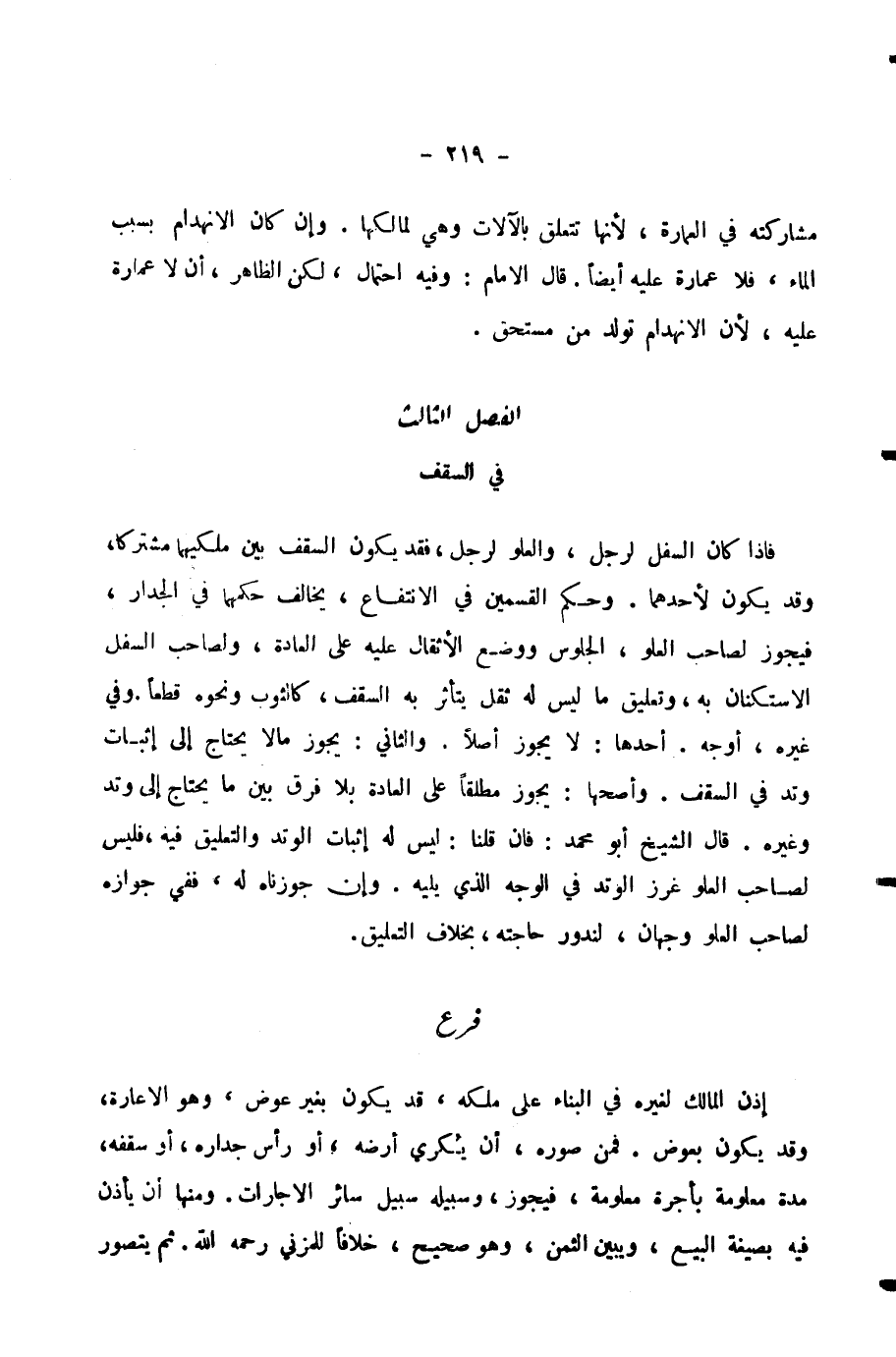 فَإِذَا كَانَ السُّفْلُ لِرَجُلٍ، وَالْعُلُوُّ لِرَجُلٍ، فَقَدْ يَكُونُ السَّقْفُ بَيْنَ مِلْكَيْهِمَا مُشْتَرَكًا، وَقَدْ يَكُونُ لِأَحَدِهِمَا. وَحُكْمُ الْقِسْمَيْنِ فِي الِانْتِفَاعِ، يُخَالِفُ حُكْمَهُمَا فِي الْجِدَارِ، فَيَجُوزُ لِصَاحِبِ الْعُلُوِّ، الْجُلُوسُ وَوَضْعُ الْأَثْقَالِ عَلَيْهِ عَلَى الْعَادَةِ، وَلِصَاحِبِ السُّفْلِ الِاسْتِكْنَانُ بِهِ، وَتَعْلِيقُ مَا لَيْسَ لَهُ ثِقَلٌ يَتَأَثَّرُ بِهِ السَّقْفُ، كَالثَّوْبِ وَنَحْوِهِ قَطْعًا. وَفِي غَيْرِهِ، أَوْجُهٌ. أَحُدُهَا: لَا يَجُوزُ أَصْلًا. وَالثَّانِي: يَجُوزُ مَا لَا يَحْتَاجُ إِلَى إِثْبَاتِ وَتِدٍ فِي السَّقْفِ. وَأَصَحُّهَا: يَجُوزُ مُطْلَقًا عَلَى الْعَادَةِ بِلَا فَرْقٍ بَيْنَ مَا يَحْتَاجُ إِلَى وَتِدٍ وَغَيْرِهِ. قَالَ الشَّيْخُ أَبُو مُحَمَّدٍ: فَإِنْ قُلْنَا: لَيْسَ لَهُ إِثْبَاتُ الْوَتِدِ وَالتَّعْلِيقُ فِيهِ، فَلَيْسَ لِصَاحِبِ الْعُلُوِّ غَرْزُ الْوَتِدِ فِي الْوَجْهِ الَّذِي يَلِيهِ. وَإِنْ جَوَّزْنَاهُ لَهُ، فَفِي جَوَازِهِ لِصَاحِبِ الْعُلُوِّ وَجْهَانِ، لِنُدُورِ حَاجَتِهِ، بِخِلَافِ التَّعْلِيقِ.