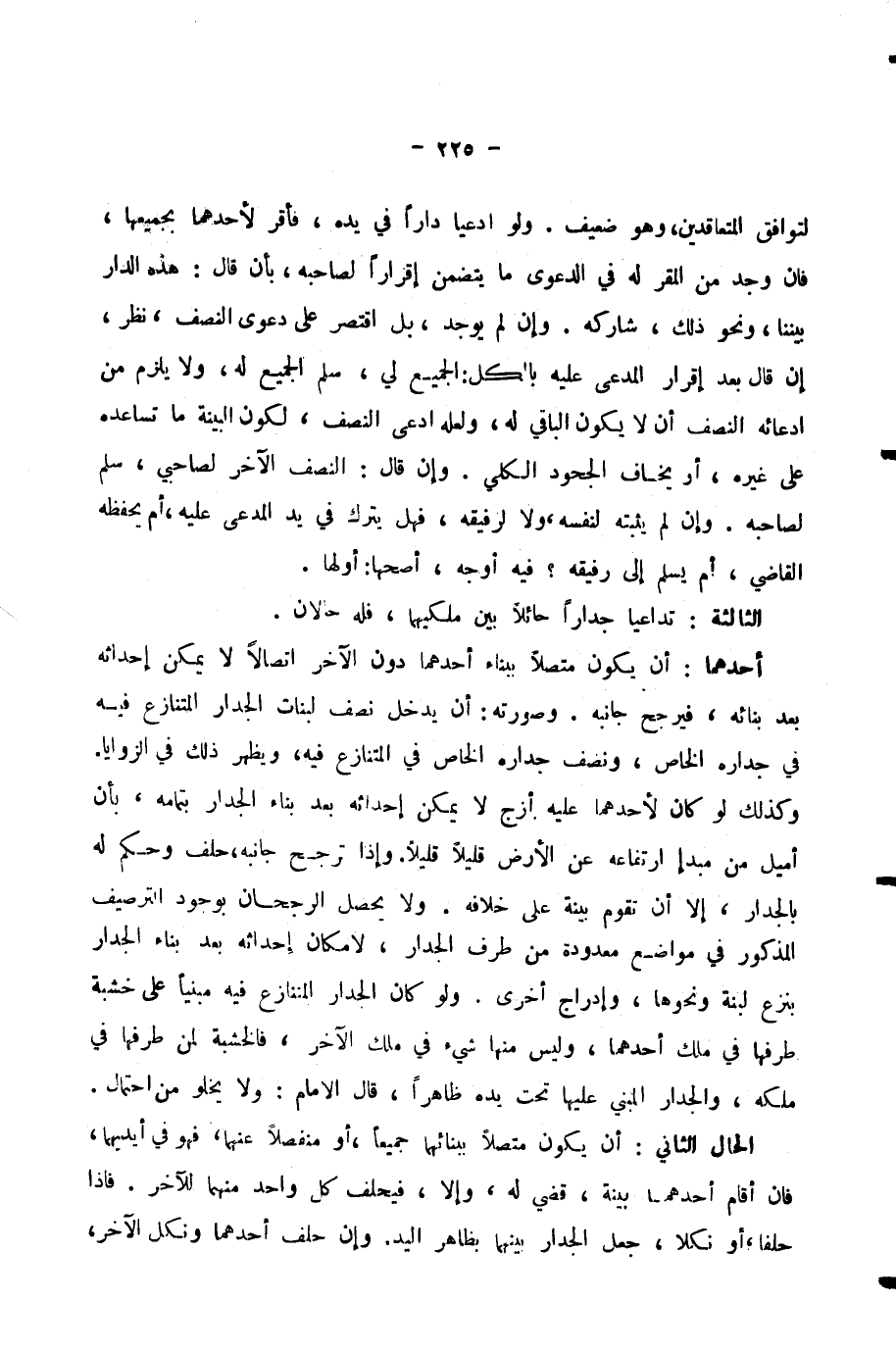 أَحَدُهُمَا: أَنْ يَكُونَ مُتَّصِلًا بِبِنَاءِ أَحَدِهِمَا دُونَ الْآخَرِ اتِّصَالًا لَا يُمْكِنُ إِحْدَاثُهُ بَعْدَ بِنَائِهِ، فَيُرَجَّحُ جَانِبُهُ. وَصُورَتُهُ: أَنْ يَدْخُلَ نِصْفُ لَبِنَاتِ الْجِدَارِ الْمُتَنَازَعِ فِيهِ فِي جِدَارِهِ الْخَاصِّ، وَنِصْفُ جِدَارِهِ الْخَاصِّ فِي الْمُتَنَازَعِ فِيهِ، وَيَظْهَرُ ذَلِكَ فِي الزَّوَايَا. وَكَذَلِكَ لَوْ كَانَ لِأَحَدِهِمَا عَلَيْهِ أَزَجٌ لَا يُمْكِنُ إِحْدَاثُهُ بَعْدَ بِنَاءِ الْجِدَارِ بِتَمَامِهِ، بِأَنْ أُمِيلَ مِنْ مَبْدَأِ ارْتِفَاعِهِ عَنِ الْأَرْضِ قَلِيلًا. وَإِذَا تَرَجَّحَ جَانِبُهُ، حَلَفَ وَحُكِمَ لَهُ بِالْجِدَارِ، إِلَّا أَنْ تَقُومَ بَيِّنَةٌ عَلَى خِلَافِهِ. وَلَا يَحْصُلُ الرُّجْحَانُ بِوُجُودِ التَّرْصِيفِ الْمَذْكُورِ فِي مَوَاضِعَ مَعْدُودَةٍ مِنْ طَرَفِ الْجِدَارِ، لِإِمْكَانِ إِحْدَاثِهِ بَعْدَ بِنَاءِ الْجِدَارِ بِنَزْعِ لَبِنَةٍ وَنَحْوِهَا، وَإِدْرَاجِ أُخْرَى. وَلَوْ كَانَ الْجِدَارُ الْمُتَنَازَعُ فِيهِ مَبْنِيًّا عَلَى خَشَبَةٍ طَرَفُهَا فِي مِلْكِ أَحَدِهِمَا، وَلَيْسَ مِنْهَا شَيْءٌ فِي مِلْكِ الْآخَرِ، فَالْخَشَبَةُ لِمَنْ طَرَفُهَا فِي مِلْكِهِ، وَالْجِدَارُ الْمَبْنِيُّ عَلَيْهَا تَحْتَ يَدِهِ ظَاهِرًا، قَالَ الْإِمَامُ: وَلَا يَخْلُو مِنَ احْتِمَالٍ.