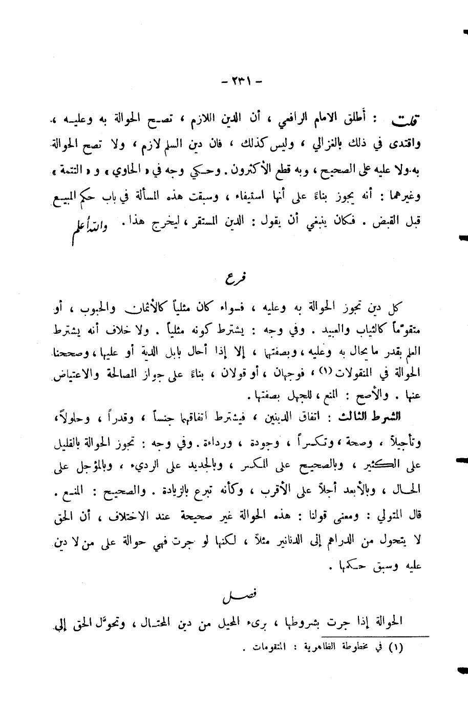 قُلْتُ: أَطْلَقَ الْإِمَامُ الرَّافِعِيُّ، أَنَّ الدَّيْنَ اللَّازِمَ، تَصِحُّ الْحَوَالَةُ بِهِ وَعَلَيْهِ، وَاقْتَدَى فِي ذَلِكَ بِالْغَزَّالِيِّ، وَلَيْسَ كَذَلِكَ، فَإِنَّ دَيْنَ السَّلَمِ لَازِمٌ، وَلَا تَصِحُّ الْحَوَالَةُ بِهِ وَلَا عَلَيْهِ عَلَى الصَّحِيحِ، وَبِهِ قَطَعَ الْأَكْثَرُونَ. وَحُكِيَ وَجْهٌ فِي «الْحَاوِي» وَ «التَّتِمَّةِ» وَغَيْرِهِمَا: أَنَّهُ يَجُوزُ بِنَاءً عَلَى أَنَّهَا اسْتِيفَاءٌ، وَسَبَقَتْ هَذِهِ الْمَسْأَلَةُ فِي بَابِ حُكْمِ الْمَبِيعِ قَبْلَ الْقَبْضِ. فَكَانَ يَنْبَغِي أَنْ يَقُولَ: الدَّيْنُ الْمُسْتَقِرُّ، لِيَخْرُجَ هَذَا. - وَاللَّهُ أَعْلَمُ -.