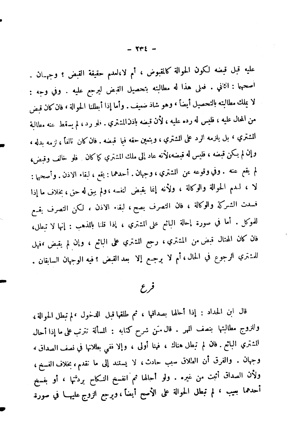 قَالَ ابْنُ الْحَدَّادِ: إِذَا أَحَالَهَا بِصَدَاقِهَا، ثُمَّ طَلَّقَهَا قَبْلَ الدُّخُولِ، لَمْ تَبْطُلِ الْحَوَالَةُ، وَلِلزَّوْجِ مُطَالَبَتُهَا بِنِصْفِ الْمَهْرِ. قَالَ مِنْ شَرْحِ كِتَابِهِ: الْمَسْأَلَةُ تَتَرَتَّبُ عَلَى مَا إِذَا أَحَالَ الْمُشْتَرِي الْبَائِعَ. فَإِنْ لَمْ تَبْطُلْ هُنَاكَ، فَهُنَا أَوْلَى، وَإِلَّا فَفِي بُطْلَانِهَا فِي نِصْفِ الصَّدَاقِ، وَجْهَانِ. وَالْفَرْقُ أَنَّ الطَّلَاقَ سَبَبٌ حَادِثٌ، لَا يَسْتَنِدُ إِلَى مَا تَقَدَّمَ، بِخِلَافِ الْفَسْخِ، وَلِأَنَّ الصَّدَاقَ أَثْبَتُ مِنْ غَيْرِهِ. وَلَوْ أَحَالَهَا ثُمَّ انْفَسَخَ النِّكَاحُ بِرِدَّتِهَا، أَوْ بِفَسْخِ أَحَدِهِمَا بِعَيْبٍ، لَمْ تَبْطُلِ الْحَوَالَةُ عَلَى الْأَصَحِّ أَيْضًا، وَيَرْجِعُ الزَّوْجُ عَلَيْهَا فِي صُورَةِ