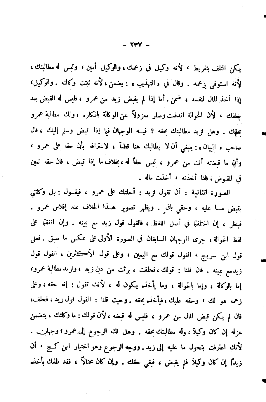 الصُّورَةُ الثَّانِيَةُ: أَنْ تَقُولَ لِزَيْدٍ: أَحَلْتُكَ عَلَى عَمْرٍو، فَيَقُولُ: بَلْ وَكَّلْتَنِي بِقَبْضِ مَا عَلَيْهِ، وَحَقِّي بَاقٍ. وَيَظْهَرُ تَصْوِيرُ هَذَا الْخِلَافِ عِنْدَ إِفْلَاسِ عَمْرٍو. فَيُنْظَرُ، إِنِ اخْتَلَفْتُمَا فِي أَصْلِ اللَّفْظِ، فَالْقَوْلُ قَوْلُ زَيْدٍ مَعَ يَمِينِهِ. وَإِنِ اتَّفَقْتُمَا عَلَى لَفْظِ الْحَوَالَةِ، جَرَى الْوَجْهَانِ السَّابِقَانِ فِي الصُّورَةِ الْأُولَى عَلَى عَكْسِ مَا سَبَقَ. فَعَلَى قَوْلِ ابْنِ سُرَيْجٍ، الْقَوْلُ قَوْلُكَ، مَعَ الْيَمِينِ، وَعَلَى قَوْلِ الْأَكْثَرِينَ، الْقَوْلُ قَوْلُ زَيْدٍ مَعَ يَمِينِهِ. فَإِنْ قُلْنَا: قَوْلُكَ، فَحَلَفْتَ، بَرِئْتَ مِنْ دَيْنِ زَيْدٍ، وَلِزَيْدٍ مُطَالَبَةُ عَمْرٍو، إِمَّا بِالْوَكَالَةِ، وَإِمَّا بِالْحَوَالَةِ، وَمَا يَأْخُذُهُ يَكُونُ لَهُ، لِأَنَّكَ تَقُولُ: إِنَّهُ حَقُّهُ، وَعَلَى زَعْمِهِ هُوَ لَكَ، وَحَقُّهُ عَلَيْكَ، فَيَأْخُذُهُ بِحَقِّهِ. وَحَيْثُ قُلْنَا: الْقَوْلُ قَوْلُ زَيْدٍ، فَحَلَفَ، فَإِنْ لَمْ يَكُنْ قَبْضُ الْمَالِ مِنْ عَمْرٍو، فَلَيْسَ لَهُ قَبْضُهُ؛ لِأَنَّ قَوْلَكَ: مَا وَكَّلْتُكَ، يَتَضَمَّنُ عَزْلَهُ إِنْ كَانَ وَكِيلًا، وَلَهُ مُطَالَبَتُكَ بِحَقِّهِ. وَهَلْ لَكَ الرُّجُوعُ إِلَى عَمْرٍو؟ وَجْهَانِ. لِأَنَّكَ اعْتَرَفْتَ بِتَحَوُّلِ مَا عَلَيْهِ إِلَى زَيْدٍ. وَوَجْهُ الرُّجُوعِ وَهُوَ اخْتِيَارُ ابْنِ كَجٍّ، أَنَّ زَيْدًا إِنْ كَانَ وَكِيلًا فَلَمْ يَقْبِضْ، فَبَقِيَ حَقُّكَ. وَإِنْ كَانَ مُحْتَالًا، فَقَدْ ظَلَمَكَ بِأَخْذِهِ