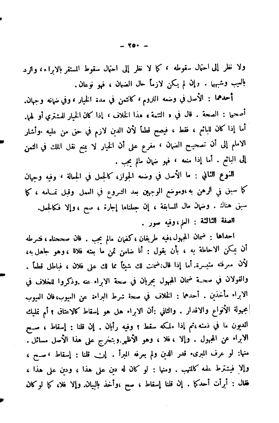 إِحْدَاهَا: ضَمَانُ الْمَجْهُولِ، فِيهِ طَرِيقَانِ، كَضَمَانِ مَا لَمْ يَجِبْ. فَإِنْ صَحَّحْنَاهُ، فَشَرْطُهُ أَنْ يُمْكِنَ الْإِحَاطَةُ بِهِ، بِأَنْ يَقُولَ: أَنَا ضَامِنٌ ثَمَنَ مَا بِعْتَهُ فُلَانًا، وَهُوَ جَاهِلٌ بِهِ؛ لِأَنَّ مَعْرِفَتَهُ مُتَيَسِّرَةٌ. أَمَّا إِذَا قَالَ: ضَمِنْتُ لَكَ شَيْئًا مِمَّا لَكَ عَلَى فُلَانٍ، فَبَاطِلٌ قَطْعًا. وَالْقَوْلَانِ فِي صِحَّةِ ضَمَانِ الْمَجْهُولِ يَجْرِيَانِ فِي صِحَّةِ الْإِبْرَاءِ عَنْهُ. وَذَكَرُوا لِلْخِلَافِ فِي الْإِبْرَاءِ مَأْخَذَيْنِ. أَحَدُهُمَا: الْخِلَافُ فِي صِحَّةِ شَرْطِ الْبَرَاءَةِ عَنِ الْعُيُوبِ، فَإِنَّ الْعُيُوبَ مَجْهُولَةُ الْأَنْوَاعِ وَالْأَقْدَارِ. وَالثَّانِي: أَنَّ الْإِبْرَاءَ هَلْ هُوَ إِسْقَاطٌ كَالْإِعْتَاقِ؟ أَمْ تَمْلِيكُ الْمَدْيُونِ مَا فِي ذِمَّتِهِ، ثُمَّ إِذَا مَلَكَهُ سَقَطَ؟ وَفِيهِ رَأْيَانِ. إِنْ قُلْنَا: إِسْقَاطٌ، صَحَّ الْإِبْرَاءُ عَنِ الْمَجْهُولِ. وَإِلَّا فَلَا، وَهُوَ الْأَظْهَرُ. وَيَتَخَرَّجُ عَلَى هَذَا الْأَصْلِ مَسَائِلُ. مِنْهَا: لَوْ عَرَفَ الْمُبَرِّئُ قَدْرَ الدَّيْنِ وَلَمْ يَعْرِفْهُ الْمُبَرَّأُ. إِنْ قُلْنَا: إِسْقَاطٌ، صَحَّ، وَإِلَّا فَيُشْتَرَطُ عِلْمُهُ كَالْمُتَّهِبِ. وَمِنْهَا: لَوْ كَانَ لَهُ دَيْنٌ عَلَى هَذَا، وَدَيْنٌ عَلَى هَذَا، فَقَالَ: أَبْرَأْتُ أَحَدَكُمَا. إِنْ قُلْنَا إِسْقَاطٌ، صَحَّ، وَأَخَذَ بِالْبَيَانِ. وَإِلَّا فَلَا، كَمَا لَوْ كَانَ