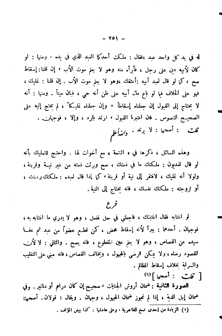 لَهُ فِي يَدِ كُلِّ وَاحِدٍ عَبْدٌ، فَقَالَ: مَلَّكْتُ أَحَدَكُمَا الْعَبْدَ الَّذِي فِي يَدِهِ. وَمِنْهَا: لَوْ كَانَ لِأَبِيهِ دَيْنٌ عَلَى رَجُلٍ، فَأَبْرَأَهُ مِنْهُ وَهُوَ لَا يَعْلَمُ مَوْتَ الْأَبِ، إِنْ قُلْنَا: إِسْقَاطٌ صَحَّ، كَمَا لَوْ قَالَ لِعَبْدِ أَبِيهِ: أُعْتِقُكَ، وَهُوَ لَا يَعْلَمُ مَوْتَ الْأَبِ. إِنْ قُلْنَا: تَمْلِيكٌ، فَهُوَ عَلَى الْخِلَافِ فِيمَا لَوْ بَاعَ مَالَ أَبِيهِ عَلَى ظَنِّ أَنَّهُ حَيٌّ، فَبَانَ مَيِّتًا. وَمِنْهَا: أَنَّهُ لَا يُحْتَاجُ إِلَى الْقَبُولِ إِنْ جَعَلْنَاهُ إِسْقَاطًا، وَإِنْ جَعَلْنَاهُ تَمْلِيكًا، لَمْ يُحْتَجْ إِلَيْهِ عَلَى الصَّحِيحِ الْمَنْصُوصِ. فَإِنِ اعْتَبَرْنَا الْقَبُولَ، ارْتَدَّ بِالرَّدِّ، وَإِلَّا فَوَجْهَانِ.
