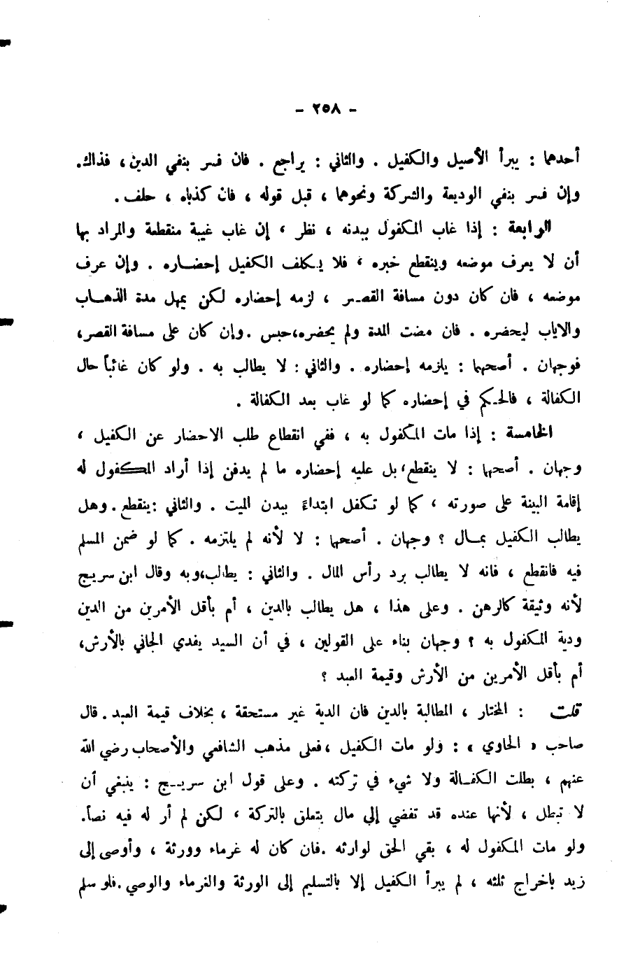 الْخَامِسَةُ: إِذَا مَاتَ الْمَكْفُولُ بِهِ، فَفِي انْقِطَاعِ طَلَبِ الْإِحْضَارِ عَنِ الْكَفِيلِ، وَجْهَانِ. أَصَحُّهُمَا: لَا يَنْقَطِعُ، بَلْ عَلَيْهِ إِحْضَارُهُ مَا لَمْ يُدْفَنْ إِذَا أَرَادَ الْمَكْفُولُ لَهُ إِقَامَةَ الْبَيِّنَةِ عَلَى صُورَتِهِ، كَمَا لَوْ تَكَفَّلَ ابْتِدَاءً بِبَدَنِ الْمَيِّتِ. وَالثَّانِي: يَنْقَطِعُ. وَهَلْ يُطَالِبُ الْكَفِيلَ بِمَالٍ؟ وَجْهَانِ. أَصَحُّهُمَا: لَا لِأَنَّهُ لَمْ يَلْتَزِمْهُ. كَمَا لَوْ ضَمِنَ الْمُسْلَمَ فِيهِ فَانْقَطَعَ، فَإِنَّهُ لَا يُطَالَبُ بِرَدِّ رَأْسِ الْمَالِ. وَالثَّانِي: يُطَالَبُ، بِهِ وَقَالَ ابْنُ سُرَيْجٍ لِأَنَّهُ وَثِيقَةٌ كَالرَّهْنِ. وَعَلَى هَذَا، هَلْ يُطَالَبُ بِالدَّيْنِ، أَمْ بِأَقَلِّ الْأَمْرَيْنِ مِنَ الدَّيْنِ وَدِيَةِ الْمَكْفُولِ بِهِ؟ وَجْهَانِ بِنَاءً عَلَى الْقَوْلَيْنِ، فِي أَنَّ السَّيِّدَ يَفْدِي الْجَانِي بِالْأَرْشِ، أَمْ بِأَقَلِّ الْأَمْرَيْنِ مِنَ الْأَرْشِ وَقِيمَةِ الْعَبْدِ؟