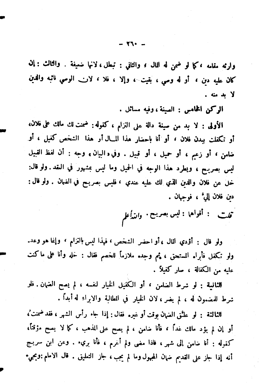 الْأُولَى: لَا بُدَّ مِنْ صِيغَةٍ دَالَّةٍ عَلَى الْتِزَامِ، كَقَوْلِهِ: ضَمِنْتُ لَكَ مَالَكَ عَلَى فُلَانٍ، أَوْ تَكَفَّلْتُ بِبَدَنِ فُلَانٍ، أَوْ أَنَا بِإِحْضَارِ هَذَا الْمَالِ أَوْ هَذَا الشَّخْصِ كَفِيلٌ، أَوْ ضَامِنٌ، أَوْ زَعِيمٌ، أَوْ حَمِيلٌ، أَوْ قَبِيلٌ. وَفِي «الْبَيَانِ» وَجْهٌ: أَنَّ لَفْظَ الْقَبِيلِ لَيْسَ بِصَرِيحٍ، وَيُطْرَدُ هَذَا الْوَجْهُ فِي الْحَمِيلِ وَمَا لَيْسَ بِمَشْهُورٍ فِي الْعَقْدِ. وَلَوْ قَالَ: خَلِّ عَنْ فُلَانٍ وَالدَّيْنُ الَّذِي لَكَ عَلَيْهِ عِنْدِي، فَلَيْسَ بِصَرِيحٍ فِي الضَّمَانِ. وَلَوْ قَالَ: دَيْنُ فُلَانٍ إِلَيَّ، فَوَجْهَانِ.