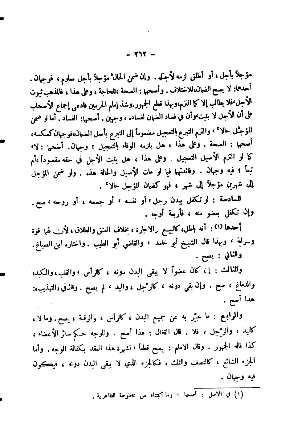 وَالرَّابِعُ: مَا عُبِّرَ بِهِ عَنْ جَمِيعِ الْبَدَنِ، كَالرَّأْسِ، وَالرَّقَبَةِ، يَصِحُّ. وَمَا لَا، كَالْيَدِ، وَالرِّجْلِ، فَلَا. قَالَ الْقَفَّالُ: هَذَا أَصَحُّ. وَلِلْوَجْهِ حُكْمُ سَائِرِ الْأَعْضَاءِ، كَذَا قَالَهُ الْجُمْهُورُ. وَقَالَ الْإِمَامُ: يَصِحُّ قَطْعًا لِشُهْرَةِ هَذَا الْعَقْدِ بِكَفَالَةِ الْوَجْهِ. وَأَمَّا الْجُزْءُ الشَّائِعُ، كَالنِّصْفِ وَالثُّلُثِ، فَكَالْجُزْءِ الَّذِي لَا يَبْقَى الْبَدَنُ دُونَهُ، فَيَكُونُ فِيهِ وَجْهَانِ.