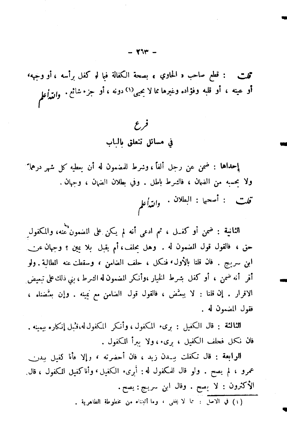 قُلْتُ: قَطَعَ صَاحِبُ «الْحَاوِي» بِصِحَّةِ الْكَفَالَةِ فِيمَا لَوْ كَفَلَ بِرَأْسِهِ، أَوْ وَجْهِهِ، أَوْ عَيْنِهِ، أَوْ قَلْبِهِ وَفُؤَادِهِ وَغَيْرِهَا مِمَّا لَا يَحْيَى دُونَهُ، أَوْ جُزْءٍ شَائِعٍ. - وَاللَّهُ أَعْلَمُ -.