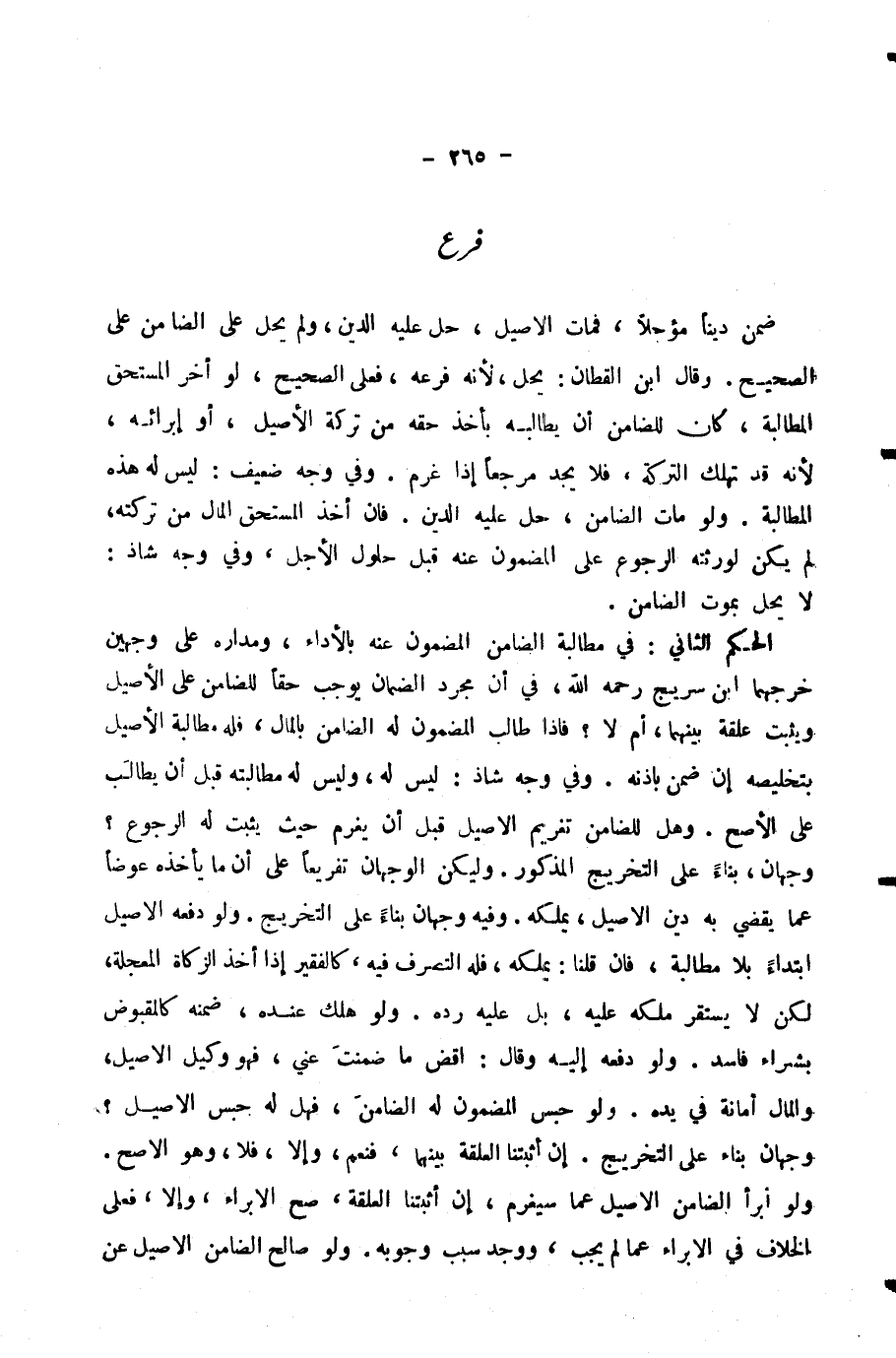 الْحُكْمُ الثَّانِي: فِي مُطَالَبَةِ الضَّامِنِ الْمَضْمُونَ عَنْهُ بِالْأَدَاءِ، وَمَدَارُهُ عَلَى وَجْهَيْنِ خَرَّجَهُمَا ابْنُ سُرَيْجٍ - رَحِمَهُ اللَّهُ -، فِي أَنَّ مُجَرَّدَ الضَّمَانِ يُوجِبُ حَقًّا لِلضَّامِنِ عَلَى الْأَصِيلِ وَيُثْبِتُ عَلَقَةً بَيْنَهُمَا، أَمْ لَا؟ فَإِذَا طَالَبَ الْمَضْمُونُ لَهُ الضَّامِنَ بِالْمَالِ، فَلَهُ مُطَالَبَةُ الْأَصِيلِ بِتَخْلِيصِهِ إِنْ ضَمِنَ بِإِذْنِهِ. وَفِي وَجْهٍ شَاذٍّ: لَيْسَ لَهُ، وَلَيْسَ لَهُ مُطَالَبَتُهُ قَبْلَ أَنْ يُطَالِبَ عَلَى الْأَصَحِّ. وَهَلْ لِلضَّامِنِ تَغْرِيمُ الْأَصِيلِ قَبْلَ أَنْ يُغَرَّمَ حَيْثُ يَثْبُتُ لَهُ الرُّجُوعُ؟ وَجْهَانِ، بِنَاءً عَلَى التَّخْرِيجِ الْمَذْكُورِ. وَلْيَكُنِ الْوَجْهَانِ تَفْرِيعًا عَلَى أَنَّ مَا يَأْخُذُهُ عِوَضًا عَمَّا يَقْضِي بِهِ دَيْنُ الْأَصِيلِ، يَمْلِكُهُ. وَفِيهِ وَجْهَانِ بِنَاءً عَلَى التَّخْرِيجِ. وَلَوْ دَفَعَهُ الْأَصِيلُ ابْتِدَاءً بِلَا مُطَالَبَةٍ، فَإِنْ قُلْنَا: يَمْلِكُهُ، فَلَهُ التَّصَرُّفُ فِيهِ، كَالْفَقِيرِ إِذَا أَخَذَ الزَّكَاةَ الْمُعَجَّلَةَ، لَكِنْ لَا يَسْتَقِرُّ مِلْكُهُ عَلَيْهِ، بَلْ عَلَيْهِ رَدُّهُ. وَلَوْ هَلَكَ عِنْدَهُ، ضَمِنَهُ كَالْمَقْبُوضِ بِشِرَاءٍ فَاسِدٍ. وَلَوْ دَفَعَهُ إِلَيْهِ وَقَالَ: اقْضِ بِهِ مَا ضَمِنْتَ عَنِّي، فَهُوَ وَكِيلُ الْأَصِيلِ، وَالْمَالُ أَمَانَةٌ فِي يَدِهِ. وَلَوْ حَبَسَ الْمَضْمُونُ لَهُ الضَّامِنَ، فَهَلْ لَهُ حَبْسُ الْأَصِيلِ؟ وَجْهَانِ بِنَاءً عَلَى التَّخْرِيجِ. إِنْ أَثْبَتْنَا الْعَلَقَةَ بَيْنَهُمَا. فَنَعَمْ وَإِلَّا فَلَا، وَهُوَ الْأَصَحُّ. وَلَوْ أَبْرَأَ الضَّامِنُ الْأَصِيلَ عَمَّا سَيُغَرَّمُ، إِنْ أَثْبَتْنَا الْعَلَقَةَ، صَحَّ الْإِبْرَاءُ، وَإِلَّا، فَعَلَى الْخِلَافِ فِي الْإِبْرَاءِ عَمَّا لَمْ يَجِبْ وَوُجِدَ سَبَبُ وُجُوبِهِ. وَلَوْ صَالَحَ الضَّامِنُ الْأَصِيلَ عَنِ