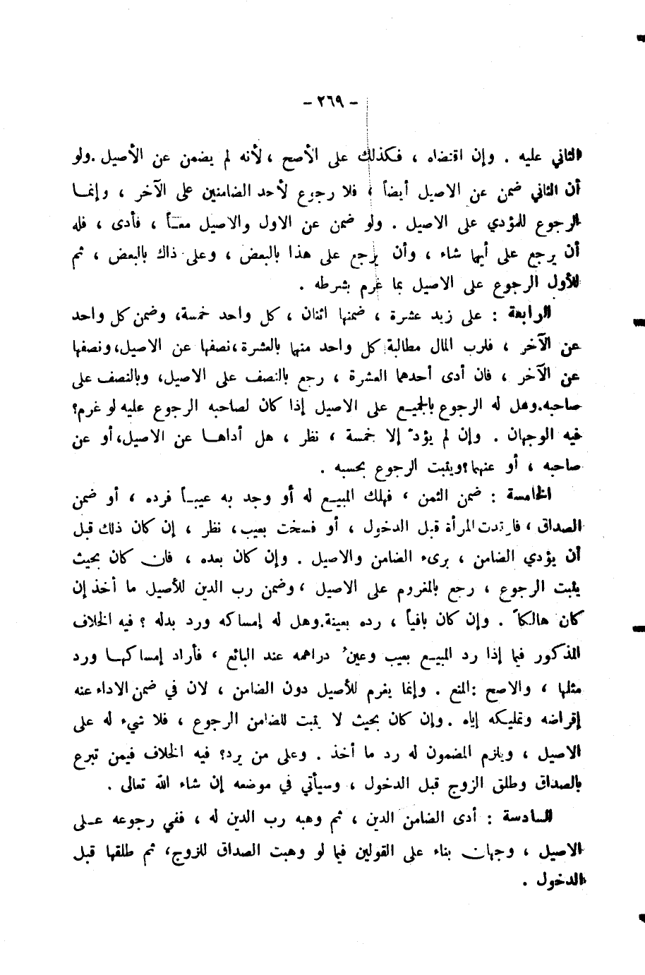 الْخَامِسَةُ: ضَمِنَ الثَّمَنَ، فَهَلَكَ الْمَبِيعُ لَهُ أَوْ وَجَدَ بِهِ عَيْبًا فَرَدَّهُ، أَوْ ضَمِنَ الصَّدَاقَ، فَارْتَدَتِ الْمَرْأَةُ قَبْلَ الدُّخُولِ، أَوْ فُسِخَتْ بِعَيْبٍ، نُظِرَ، إِنْ كَانَ ذَلِكَ قَبْلَ أَنْ يُؤَدِّيَ الضَّامِنُ، بَرِئَ الضَّامِنُ وَالْأَصِيلُ. وَإِنْ كَانَ بَعْدَهُ، فَإِنْ كَانَ بِحَيْثُ يَثْبُتُ الرُّجُوعُ، رَجَعَ بِالْمَغْرُومِ عَلَى الْأَصِيلِ، وَضَمِنَ رَبُّ الدَّيْنِ لِلْأَصِيلِ مَا أَخَذَ إِنْ كَانَ هَالِكًا. وَإِنْ كَانَ بَاقِيًا، رَدَّهُ بِعَيْنِهِ. وَهَلْ لَهُ إِمْسَاكُهُ وَرَدُّ بَدَلِهِ؟ فِيهِ الْخِلَافُ الْمَذْكُورُ فِيمَا إِذَا رَدَّ الْمَبِيعَ بِعَيْبٍ وَعَيَّنَ دَرَاهِمَهُ عِنْدَ الْبَائِعِ، فَأَرَادَ إِمْسَاكَهَا وَرَدَّ مِثْلِهَا، وَالْأَصَحُّ: الْمَنْعُ. وَإِنَّمَا يَغْرَمُ لِلْأَصِيلِ دُونَ الضَّامِنِ؛ لِأَنَّ فِي ضِمْنِ الْأَدَاءِ عَنْهُ إِقْرَاضُهُ وَتَمْلِيكُهُ إِيَّاهُ. وَإِنْ كَانَ بِحَيْثُ لَا يَثْبُتُ لِلضَّامِنِ الرُّجُوعُ، فَلَا شَيْءَ لَهُ عَلَى الْأَصِيلِ، وَيَلْزَمُ الْمَضْمُونَ لَهُ رَدُّ مَا أَخَذَ. وَعَلَى مَنْ يَرُدُّ؟ فِيهِ الْخِلَافُ فِيمَنْ تَبَرَّعَ بِالصَّدَاقِ وَطَلَّقَ الزَّوْجُ قَبْلَ الدُّخُولِ، وَسَيَأْتِي فِي مَوْضِعِهِ إِنْ شَاءَ اللَّهُ تَعَالَى.