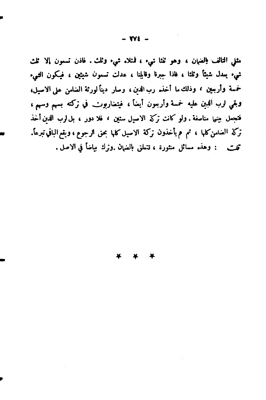 قُلْتُ: وَهَذِهِ مَسَائِلُ مَنْثُورَةٌ، تَتَعَلَّقُ بِالضَّمَانِ. وَتَرَكَ بَيَاضًا فِي الْأَصْلِ.