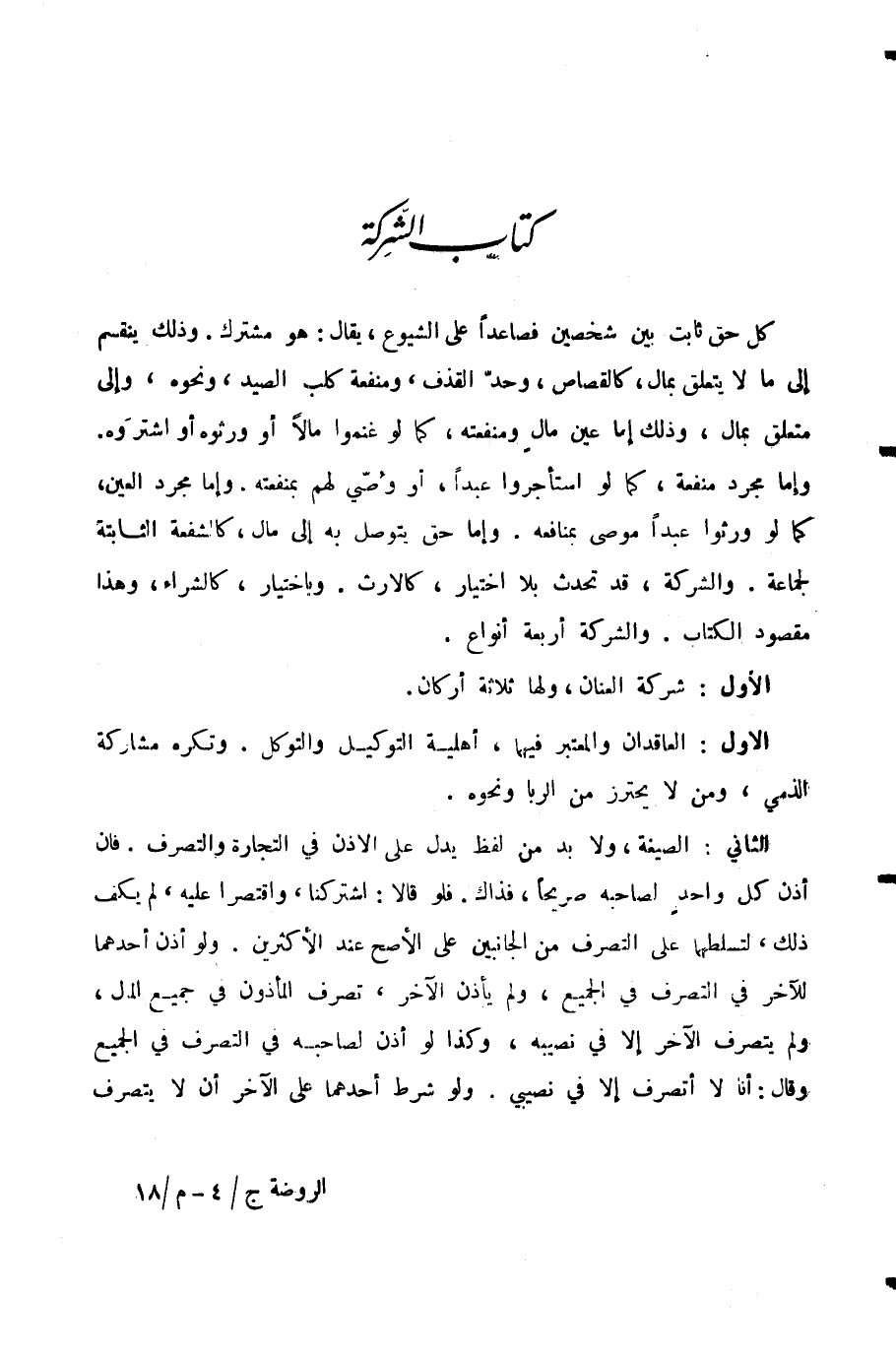 كُلُّ حَقٍّ ثَابِتٍ بَيْنَ شَخْصَيْنِ فَصَاعِدًا عَلَى الشُّيُوعِ، يُقَالُ: هُوَ مُشْتَرَكٌ وَذَلِكَ يَنْقَسِمُ إِلَى مَا لَا يَتَعَلَّقُ بِمَالٍ، كَالْقِصَاصِ، وَحَدِّ الْقَذْفِ، وَمَنْفَعَةِ كَلْبِ الصَّيْدِ، وَنَحْوِهِ، وَإِلَى مُتَعَلِّقٍ بِمَالٍ، وَذَلِكَ إِمَّا عَيْنُ مَالٍ وَمَنْفَعَتِهِ، كَمَا لَوْ غَنِمُوا مَالًا أَوْ وَرِثُوهُ أَوِ اشْتَرَوْهُ. وَإِمَّا مُجَرَّدُ مَنْفَعَةٍ، كَمَا لَوِ اسْتَأْجَرُوا عَبْدًا، أَوْ وُصَّى لَهُمْ بِمَنْفَعَتِهِ. وَإِمَّا مُجَرَّدُ الْعَيْنِ، كَمَا لَوْ وَرِثُوا عَبْدًا مُوصَى بِمَنَافِعِهِ. وَإِمَّا حَقٌّ يُتَوَصَّلُ بِهِ إِلَى مَالٍ، كَالشُّفْعَةِ الثَّابِتَةِ لِجَمَاعَةٍ. وَالشَّرِكَةُ قَدْ تَحْدُثُ بِلَا اخْتِيَارٍ كَالْإِرْثِ، وَبِاخْتِيَارٍ كَالشِّرَاءِ، وَهَذَا مَقْصُودُ الْكِتَابِ. وَالشَّرِكَةُ أَرْبَعَةُ أَنْوَاعٍ.