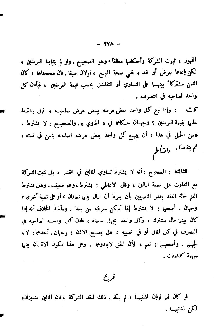 الْجُمْهُورِ، ثُبُوتُ الشَّرِكَةِ وَأَحْكَامِهَا مُطْلَقًا، وَهُوَ الصَّحِيحُ. وَلَوْ لَمْ يَتَبَايَعَا الْعَرْضَيْنِ، لَكِنْ بَاعَاهُمَا بِعَرْضٍ أَوْ نَقْدٍ، فَفِي صِحَّةِ الْبَيْعِ، قَوْلَانِ سَبَقَا. فَإِنْ صَحَّحْنَاهَا، كَانَ الثَّمَنُ مُشْتَرَكًا بَيْنَهُمَا عَلَى التَّسَاوِي أَوِ التَّفَاضُلِ بِحَسَبِ قِيمَةِ الْعَرْضَيْنِ، فَيَأْذَنُ كُلُّ وَاحِدٍ لِصَاحِبِهِ فِي التَّصَرُّفِ.