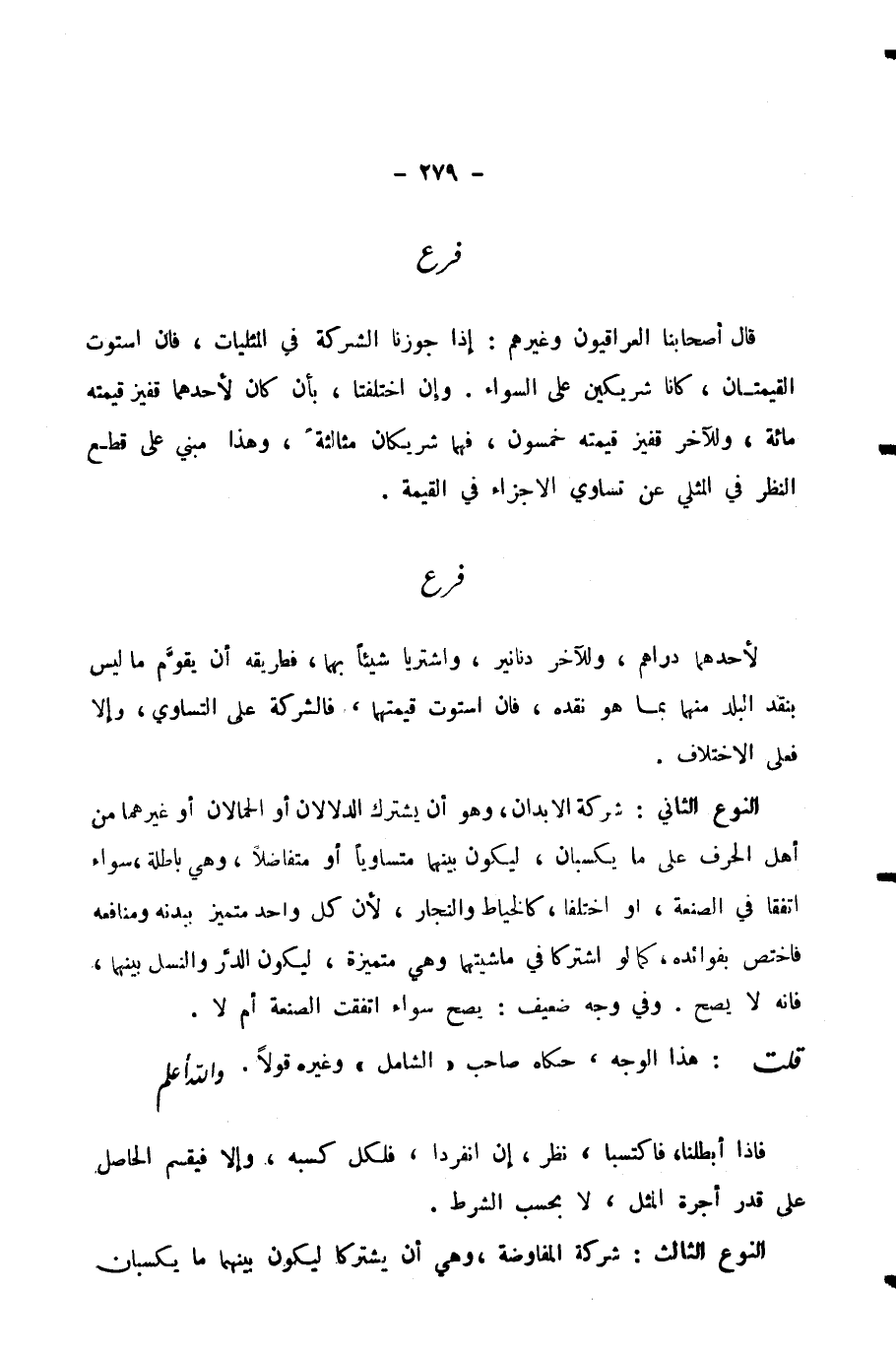 قَالَ أَصْحَابُنَا الْعِرَاقِيُّونَ وَغَيْرُهُمْ: إِذَا جَوَّزْنَا الشَّرِكَةَ فِي الْمِثْلِيَّاتِ، فَإِنِ اسْتَوَتِ الْقِيمَتَانِ، كَانَا شَرِيكَيْنِ عَلَى السَّوَاءِ. وَإِنِ اخْتَلَفَتَا، بِأَنْ كَانَ لِأَحَدِهِمَا قَفِيزٌ قِيمَتُهُ مِائَةٌ، وَلِلْآخَرِ قَفِيزٌ قِيمَتُهُ خَمْسُونَ، فَهُمَا شَرِيكَانِ مُثَالَثَةً، وَهَذَا مَبْنِيٌّ عَلَى قَطْعِ النَّظَرِ فِي الْمِثْلِيِّ عَنْ تَسَاوِي الْأَجْزَاءِ فِي الْقِيمَةِ.